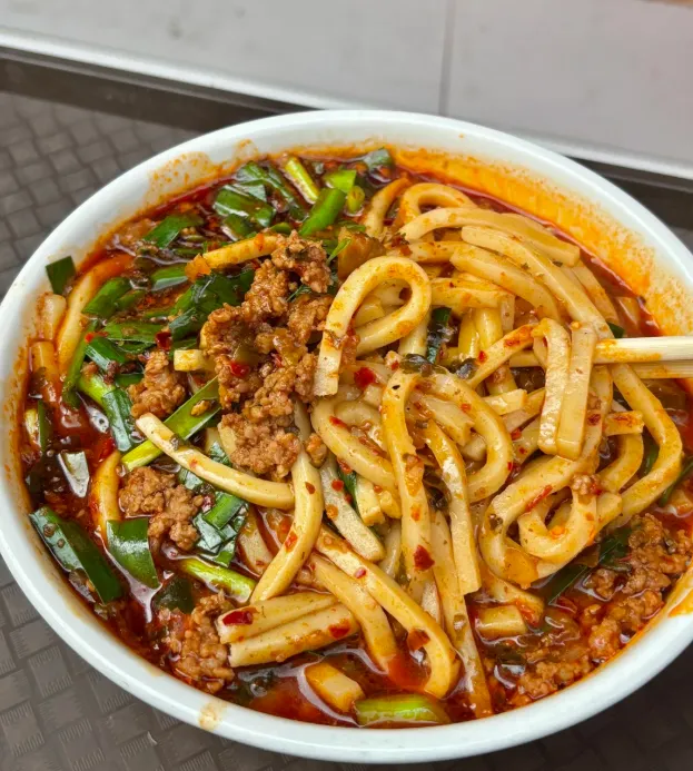 饵丝:大米磨成圆条,腊肉油渣下锅炒。去古城小巷早摊,现点现拌。
