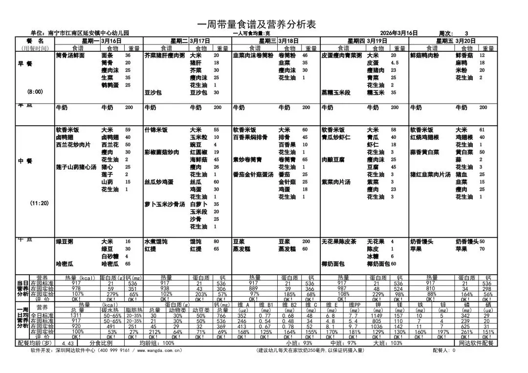 亲爱的家长朋友们,幼儿的健康成长离不开科学营养的饮食搭配!我园每周精心定制的带量食谱已新鲜出炉,每一餐都严格遵循幼儿营养需求,精选当季新鲜食材,合理搭配蛋白质、维生素、膳食纤维等营养元素,确保宝贝们吃得健康、吃得开心!