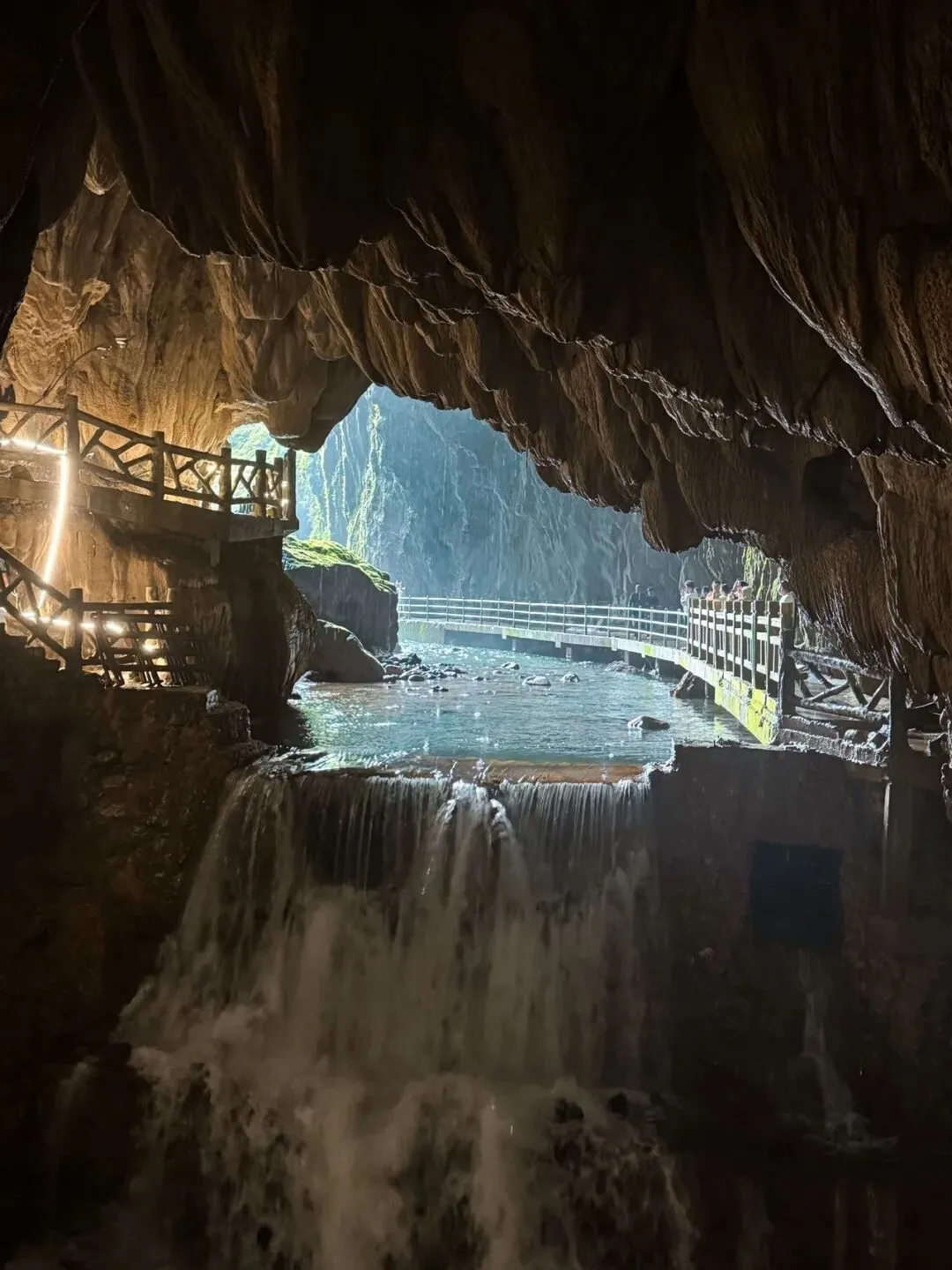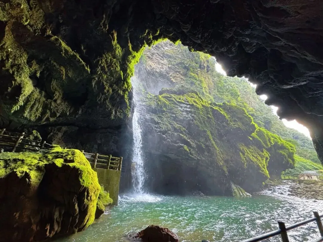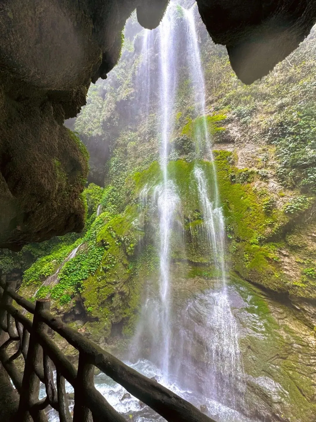 最神奇的是,瀑布背后还藏着一个水帘洞!沿着瀑布旁的步道往里走,就能进入这个“秘境中的秘境”。