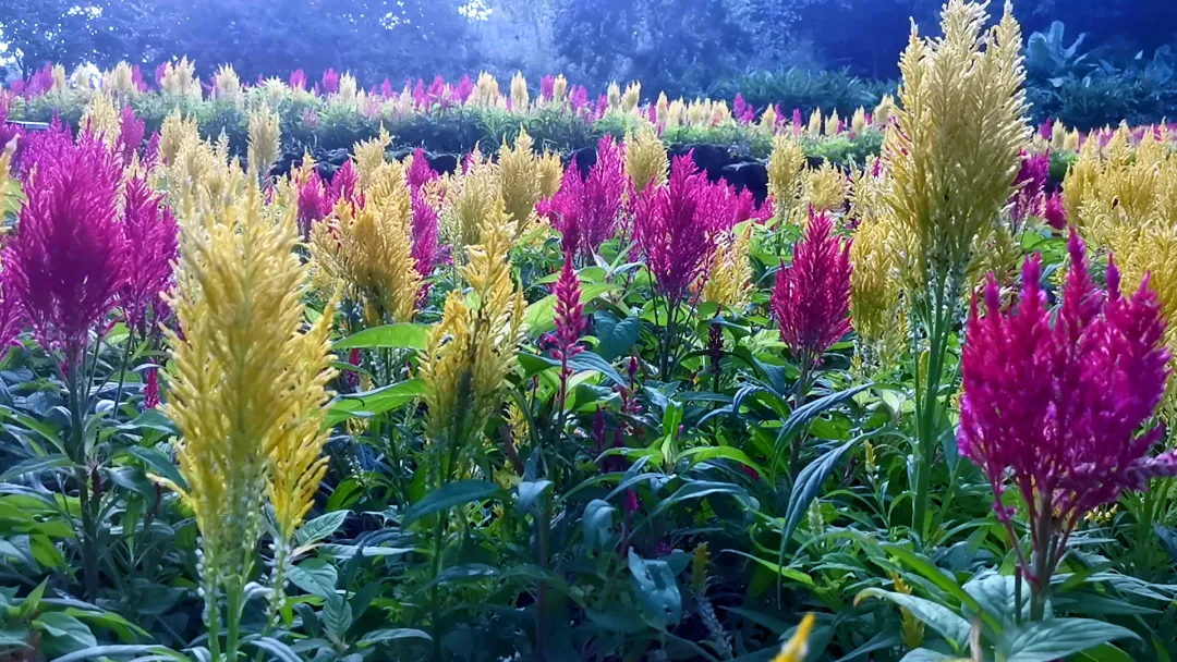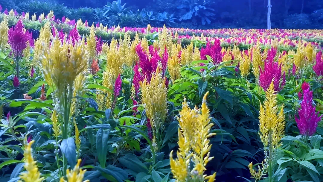 走进绚阑花田,仿佛闯进了童话世界——成片的穗冠花、木棉花、杜鹃花竞相绽放,红的似火、粉的似霞、黄的似金,层层叠叠的花海在风中轻轻摇曳,像一片流动的彩色波浪。