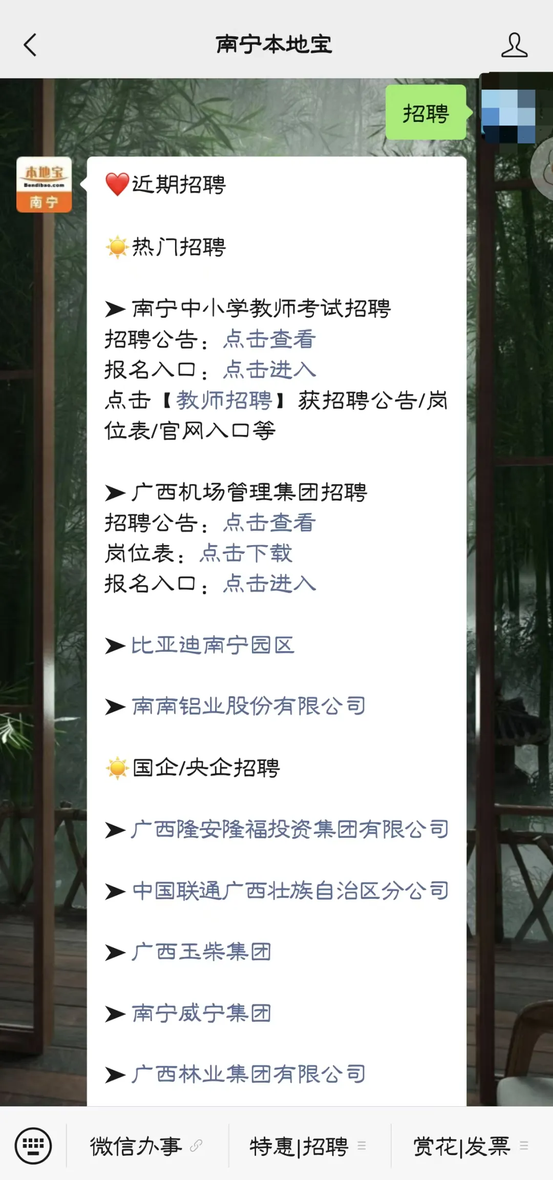 关注【南宁本地宝】公众号,在对话框回复【招聘】,可获招聘启事全文、岗位表/报名表下载。