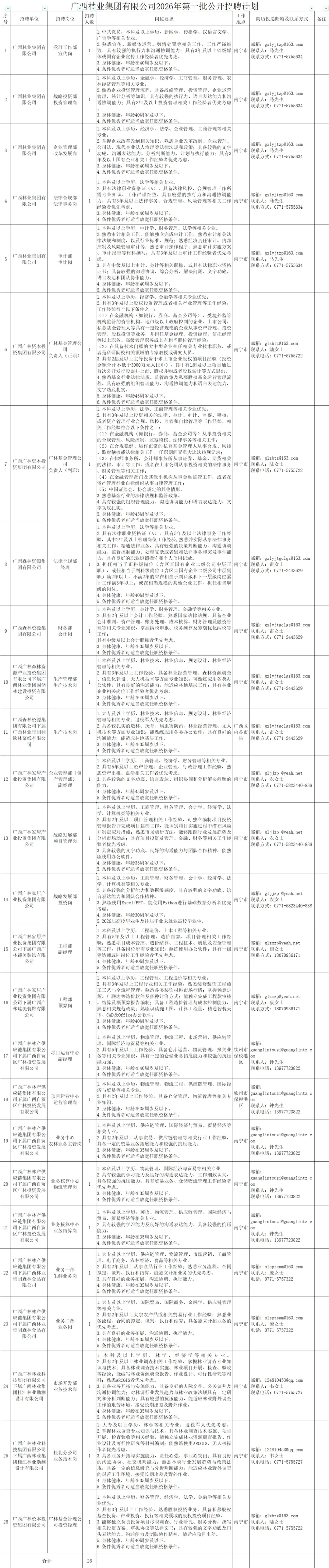 本次共计划招聘广西林业集团有限公司本部及下属企业岗位人员26人。具体招聘岗位及要求详见《广西林业集团有限公司2026年第一批公开招聘计划》。