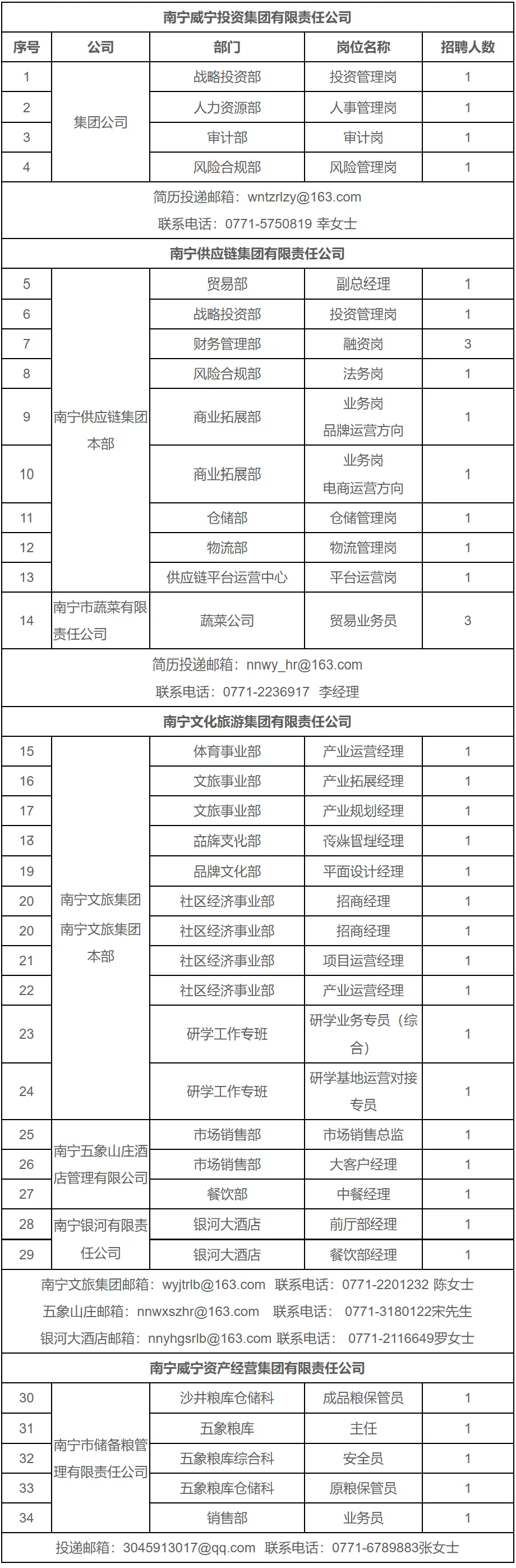 本次招聘采取网上报名方式,报名截止时间为2026年3月20日, 具体岗位要求和简历投递邮箱、联系电话详见《南宁威宁集团及各下属企业2026年第一季度招聘岗位及条件》,符合条件的人选请下载《南宁威宁集团应聘登记表》填写发送相应邮箱。邮件主题及应聘登记表命名为“应聘公司+岗位名称+姓名” ,并选择邮件回执。每位应聘者仅能选择一个职位投递简历,请勿重复投递。