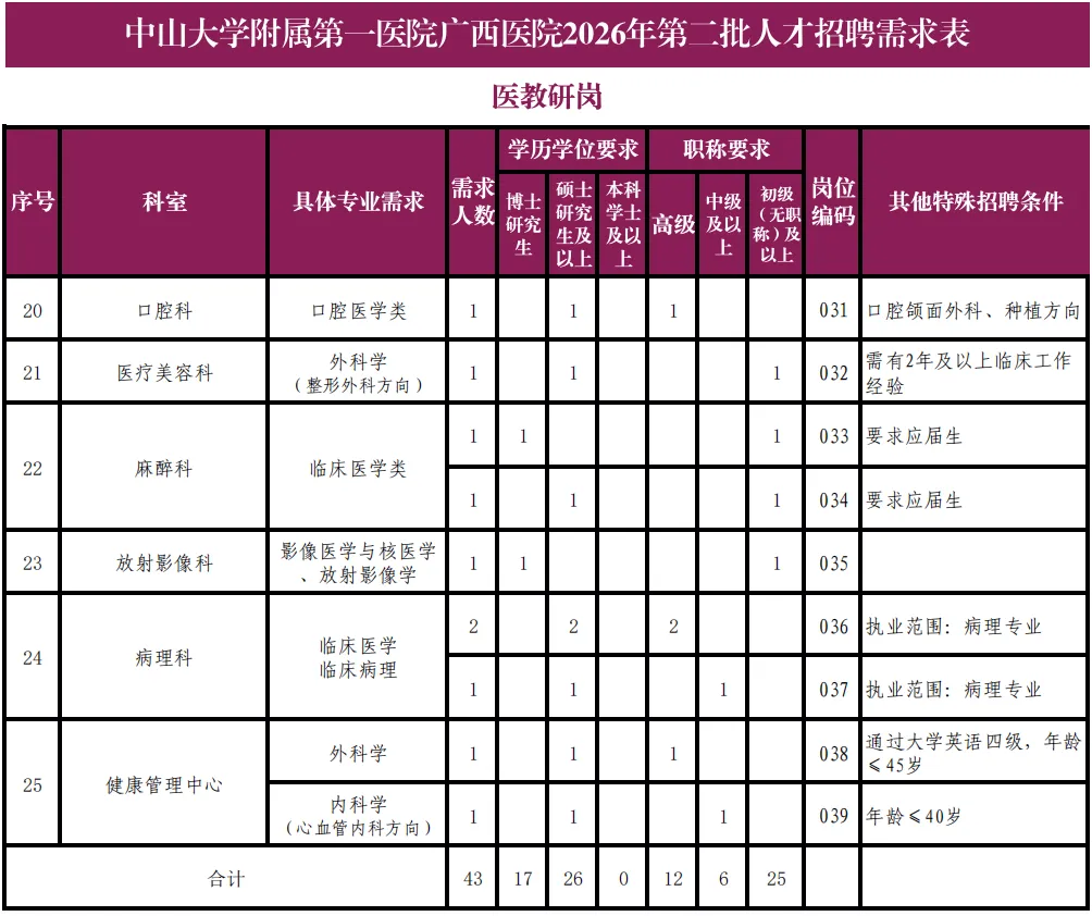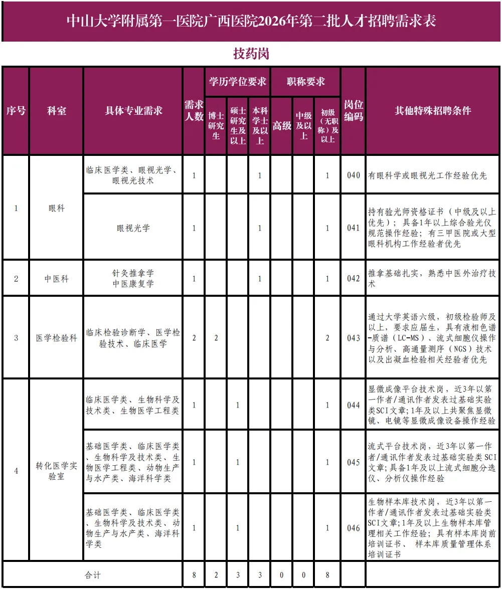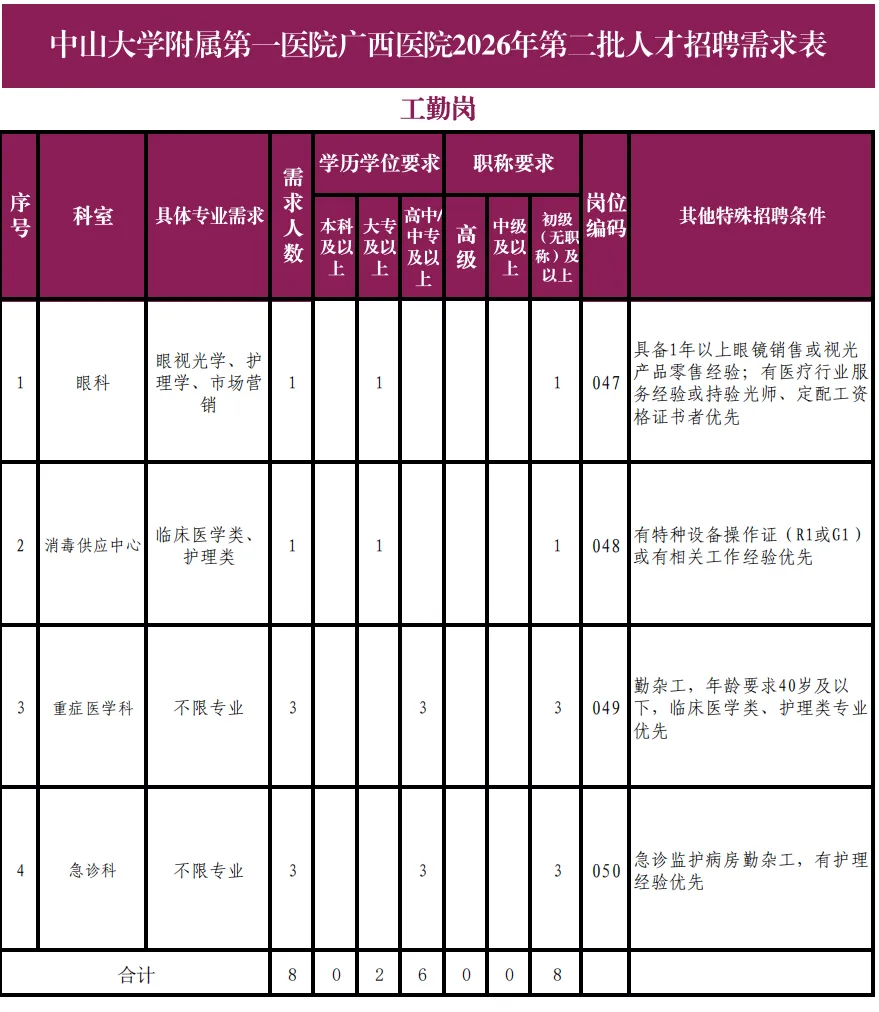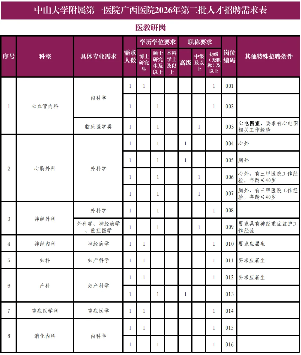 详见《中山大学附属第一医院广西医院2026年第二批人才招聘需求表》。