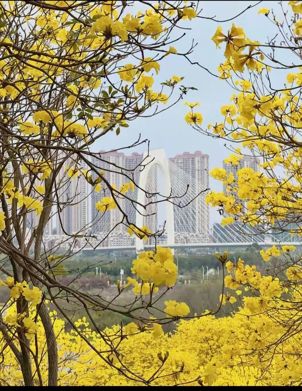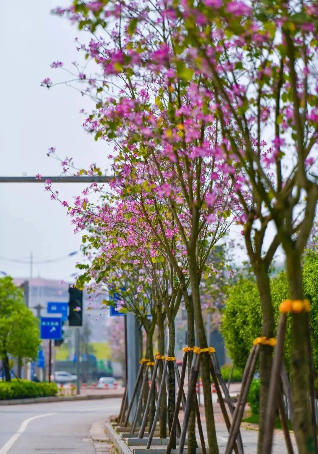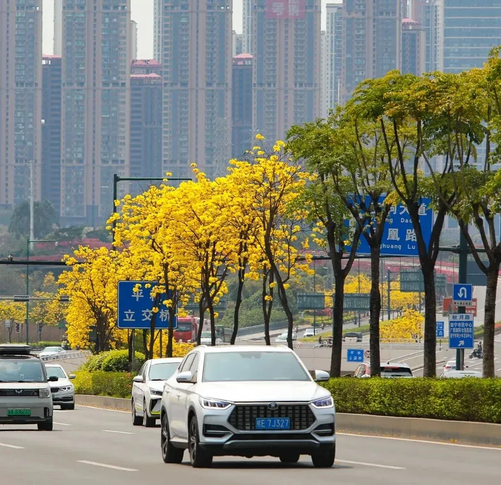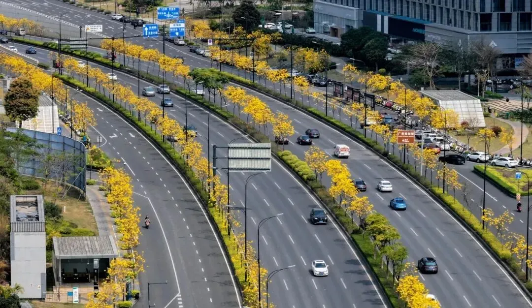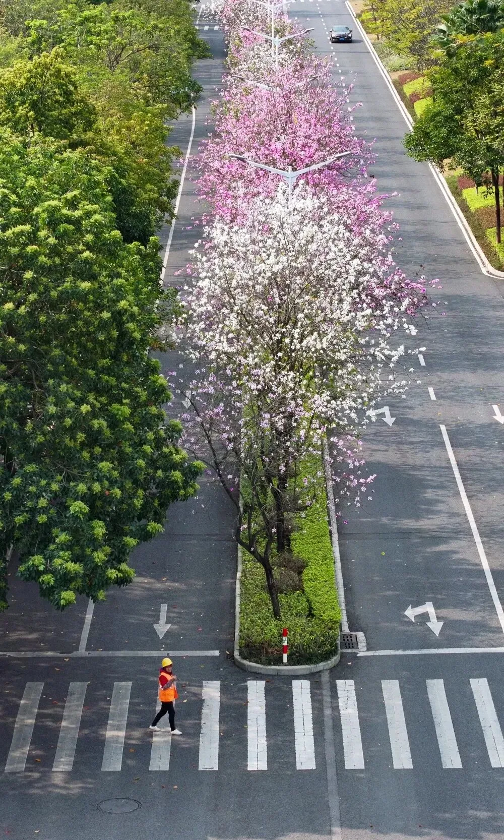 更让人惊喜的是五象的“四季花海”。春日的平乐大道,黄花风铃木盛放成金色长廊,阳光穿过花簇,洒下斑驳的光影,随手一拍都是大片;秋月路、体强路的洋紫荆,粉白相间的花瓣随风飘落,铺成浪漫的花径;到了夏天,凤凰花、三角梅热烈绽放,为新城添上一抹明艳;秋日的异木棉、冬日的腊梅,让五象全年都有花可赏。不同于老城区的“季节性赏花”,五象的花海是日常,是漫步时不经意的遇见,是生活里最温柔的风景