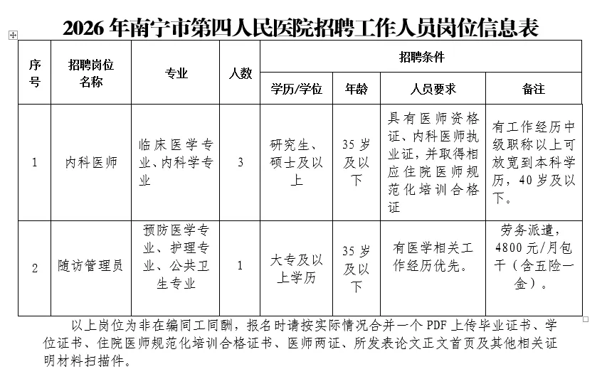 南宁市第四人民医院是南宁市唯一一所以传染病诊疗为特色,兼具综合学科优势的三级甲等专科医院,是广西艾滋病临床治疗中心(南宁)、广西感染性疾病(艾滋病)临床医学研究中心、广西博士后创新实践基地、国家感染性疾病临床医学研究中心分中心,医院传染病诊疗技术达国内先进水平,非传染病诊疗技术达广西区内三级医院水平。目前医院设有30多个临床医技科室,开放床位700张,按照“强专科,优综合”思路发展学科专业。医院建设有中国科学院王福生院士领衔的南宁市高层次专家团队协同创新中心、中国工程院廖万清院士团队专家工作站及首都医科大学附属北京胸科医院肺病诊疗与研究协同创新中心(南宁)等多个高层次临床科研平台。医院的感染性疾病科是广西临床重点专科、广西医药卫生重点学科,艾滋病临床中心、结核科、传染病实验室是南宁市医学重点学科(实验室)。医院先后荣获全国先进基层党组织、全国抗击新冠肺炎疫情先进集体、全国五一劳动奖状、全国学雷锋活动示范点、全国红十字示范单位、全国五四红旗团委、全国管理创新医院、全国人文爱心医院、全国公立医院党建示范医院等荣誉。具体岗位详见《南宁市第四人民医院2026年公开招聘人才岗位信息表》(附件1)。(一)遵纪守法,品行端正,有较强的事业心和责任心。(二)具备岗位所需的基础理论、专业知识和工作技能。(三)具备相应的学历和学位,各专业技术岗位须取得相应的执业准入资格或专业技术资格。凡受到党纪、政纪处分或者正在接受纪律调查的人员,以及受刑事处罚或正在接受司法调查及尚未做出结论的人员,不接受其应聘申请。医院招聘具体岗位、人数、专业要求等见招聘工作人员岗位信息表。资格审查不合格的人员不纳入招聘对象。资格审查贯穿于招聘工作的全过程,凡发现考生与招聘岗位所要求的资格条件不符的,立即取消其应聘资格。1.报名时间:2026年3月11 日至3月17日。(1)先微信扫描下方二维码进行个人信息填报,按要求如实填写后提交。 微信报名后,必须将个人简历电子版按“应聘岗位名称+姓名+学历+专业+岗位”发到指定人事科邮箱rsk5656083@163.com,个人简历内容包括:个人基本情况介绍,并合并一个PDF扫描文件(包括:身份证、毕业证、学位证、职称或资格证、执业证、住院医师规范化培训合格证书、获奖证书等)。应聘人员资格核查由医院相关用人科室初审、人事科复核,并且应聘人员资格核查贯穿于招聘、聘用工作始终。应聘人员需如实填写、提交个人相关信息资料,如有弄虚作假,取消其应聘资格。(四)考核所有岗位由人事科安排用人科室组织试工,时间及地点由各用人科室与应聘人员确定。医院人事科根据试工结果考察应聘人员的政治思想、道德品质、工作业绩、廉洁自律等表现。对应聘者资格条件进行复查,考核不合格者不予录用。根据考核结果择优确定拟聘用人员,按照《中共广西壮族自治区委员会组织部 广西壮族自治区人力资源和社会保障厅 广西壮族自治区卫生健康委员会关于进一步规范事业单位公开招聘人员体检工作有关问题的通知》(桂人社规〔2019〕11号)和《广西壮族自治区人力资源和社会保障厅 广西壮族自治区卫生健康委员会关于印发〈广西壮族自治区事业单位公开招聘人员体检通用标准(试行)〉及〈广西壮族自治区事业单位公开招聘人员体检操作手册(试行)〉的通知》(桂人社规〔2024〕3号)执行。1.享受国家规定的工资福利待遇,同工同酬,购买五险一金,享受带薪年休、工会福利、健康体检等,报销外出学习及进修的费用。2.经住院医师规范化培训合格的本科学历临床医师执行“两个同等对待”政策(“两个同等对待”指:面向社会招收的普通高校应届毕业生培训对象,培训合格当年在医疗卫生机构就业的,在招聘、派遣、落户等方面,按当年应届毕业生同等对待;对经住培合格的本科学历临床医师,在人员招聘、职称晋升、岗位聘用、薪酬待遇等方面,与临床医学、口腔医学、中医专业学位硕士研究生同等对待)。欢迎转载,为维护原文的准确、真实性,请勿作原则性修改,转载请注明出处。