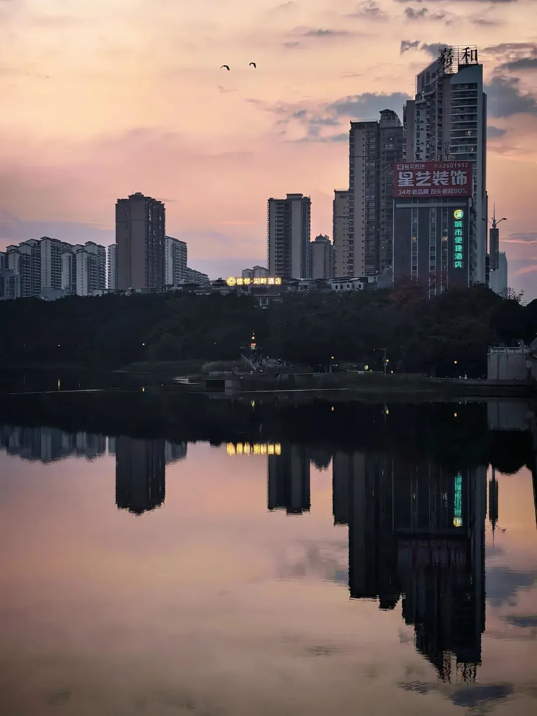 水面是晚霞最好的画布。当南湖的波纹趋于平静,高楼、云霞与灯光便在水中形成完美的对称,仿佛将城市“折叠”进温柔的暮色里。