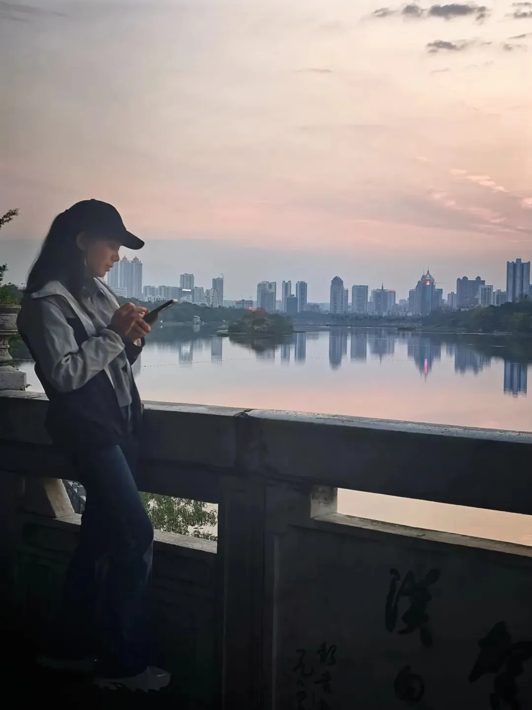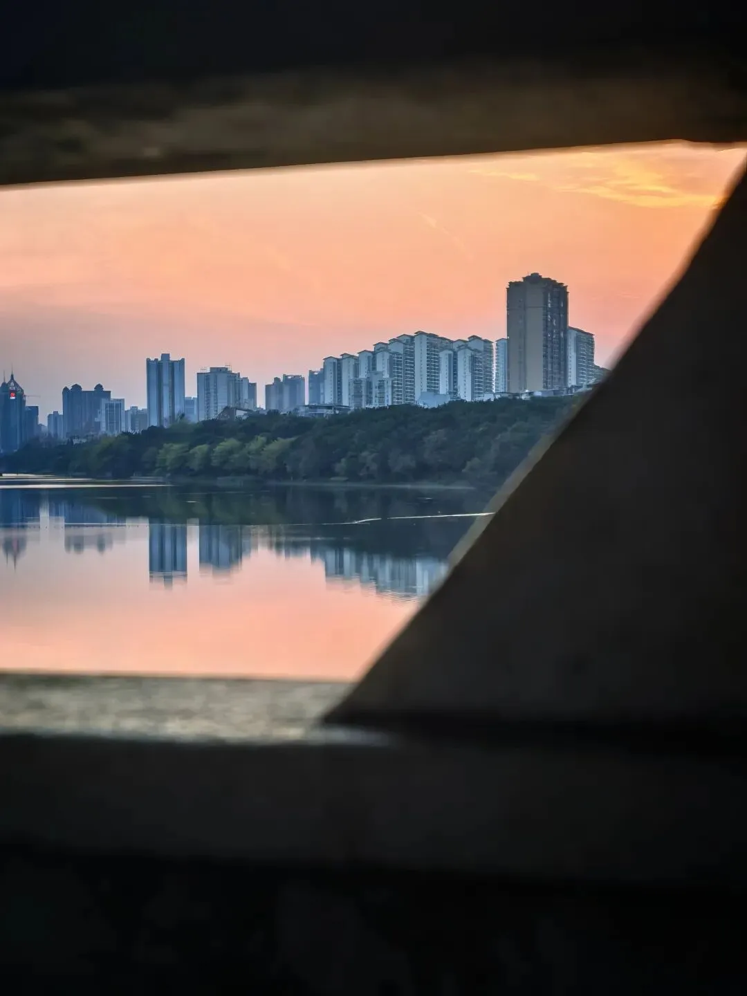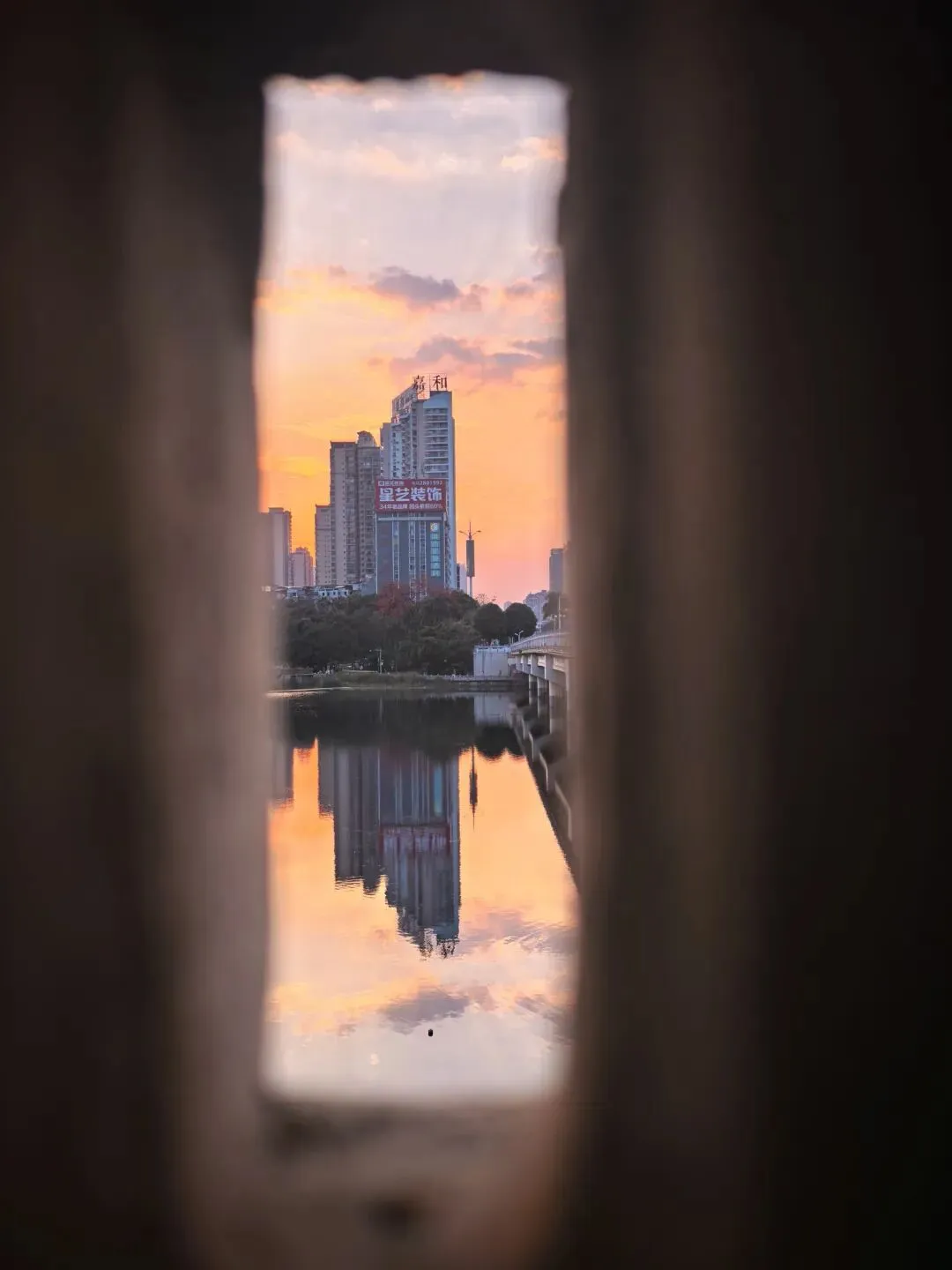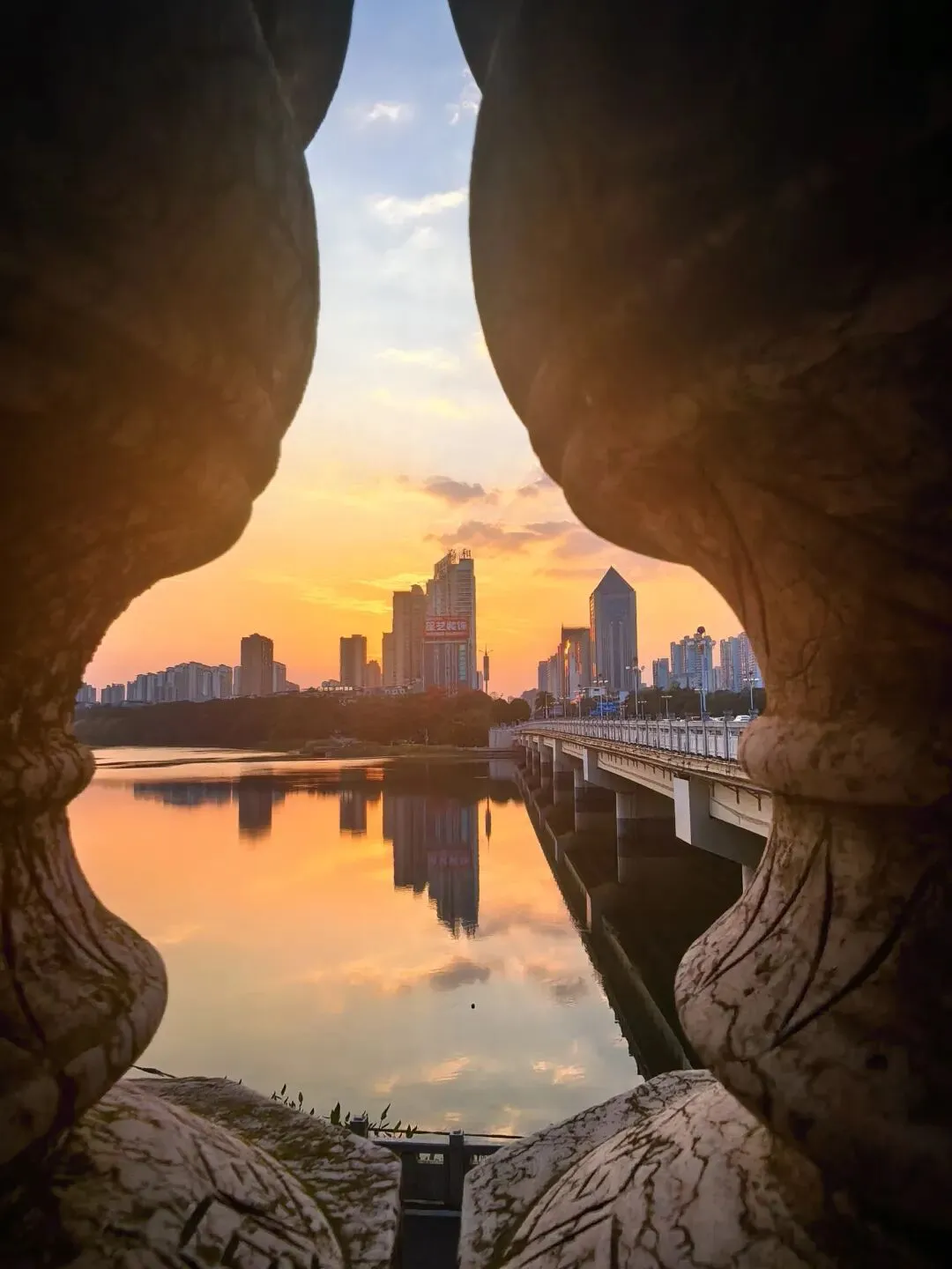 南湖大桥的栏杆、雕塑孔洞、树影枝桠,都是天然的“取景框”。透过这些框架看晚霞,既压缩了画面空间,又突出了远处的天际线,让照片更有故事感。