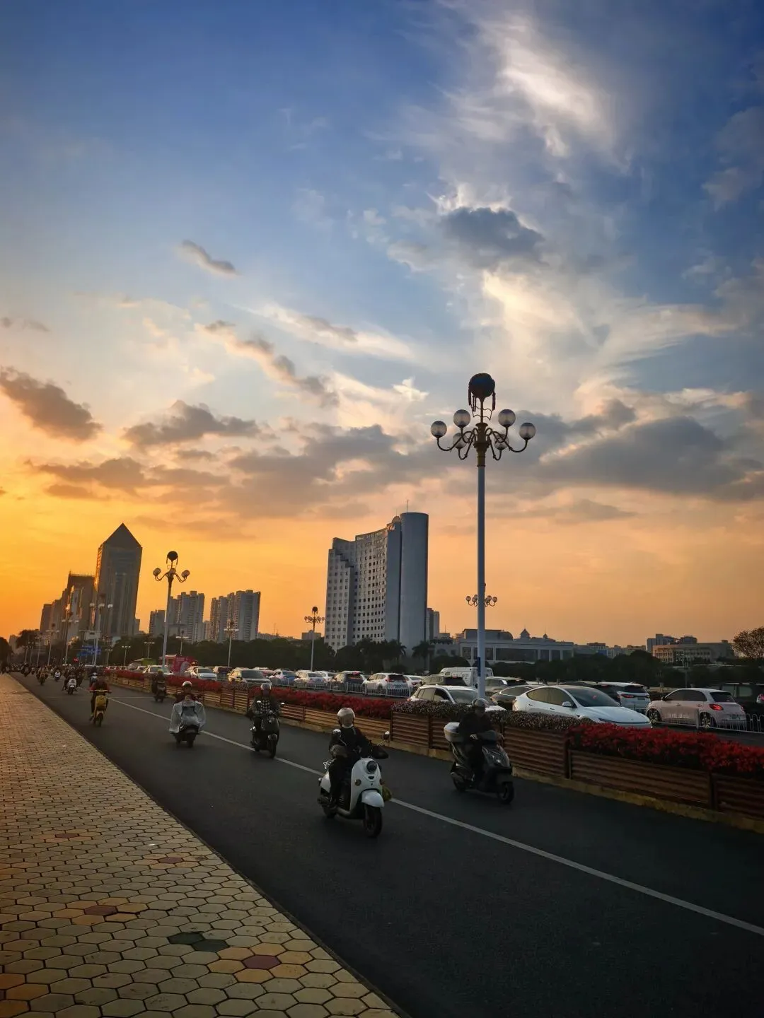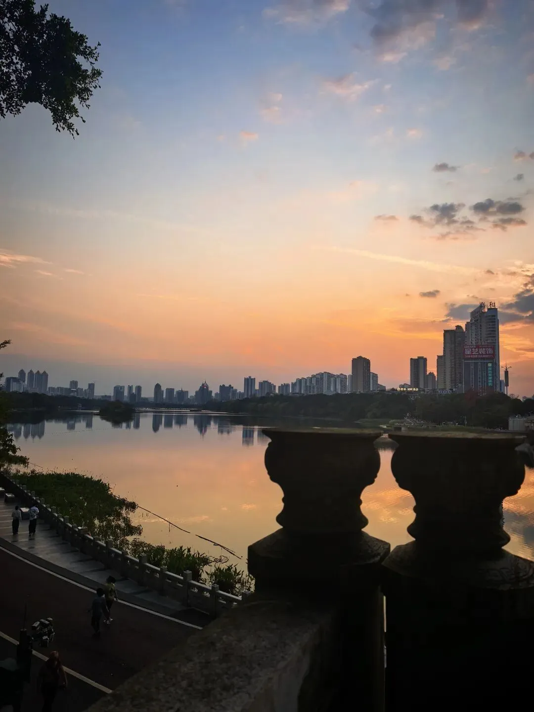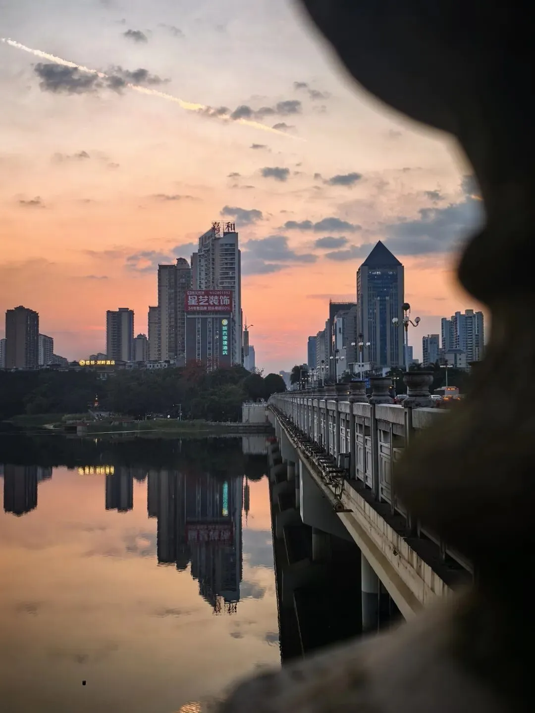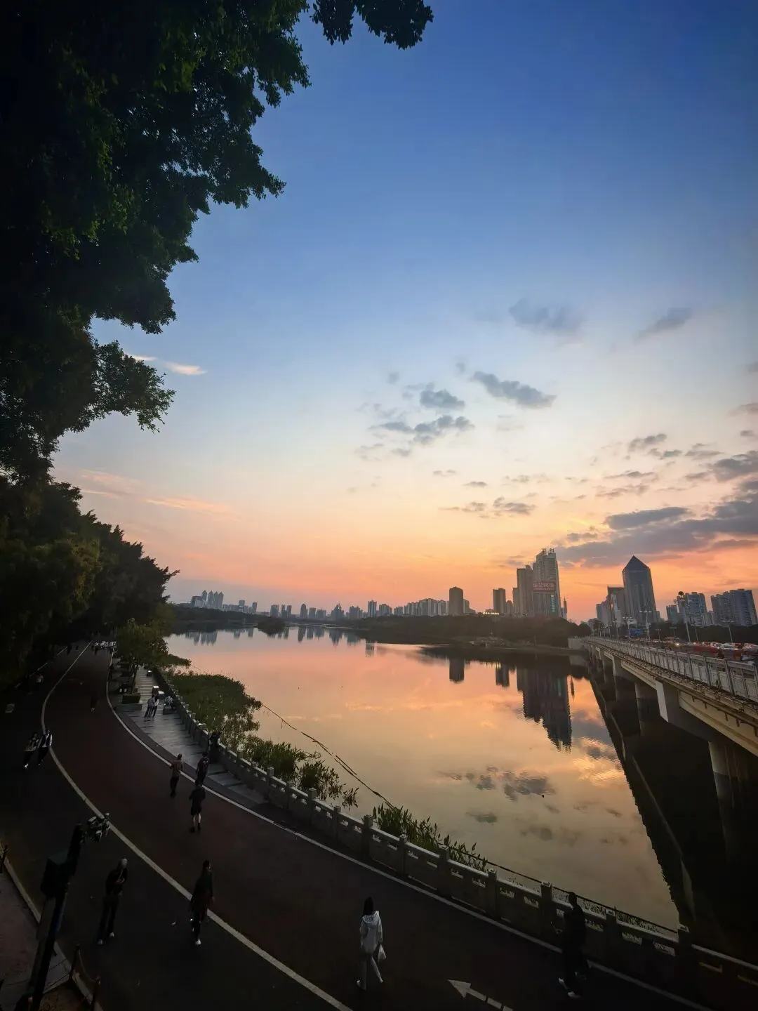 晚霞的浪漫,不止于风景,更在于“人与城市的互动”。倚栏看手机的行人、桥上穿梭的电动车、树影下的驻足身影,都是暮色里的生动注脚。