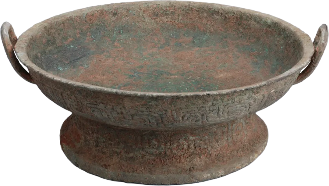 西周双耳重环纹铜盘,1985年南宁市武鸣元龙坡先秦墓葬33号墓出土。盘内中心饰六瓣花纹,六瓣花纹以外为三道重环纹,器外腹部饰窃曲纹,圈足外饰云雷纹。从器形和纹饰来看,应为中原传入,其铸造年代为西周时期。盘内有水时,六瓣花相映,具有一定的审美意蕴。铜盘为较典型中原文化器物, 表明这一时期的骆越文化和中原内地之间已经出现了一定程度的交流,彰显了中华文化的多元一体与兼容并包。
