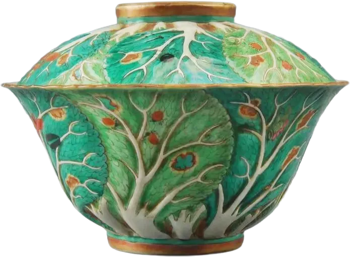 “大清嘉庆年制”款粉彩茂林百虫花口盖碗,1985年南宁市外贸局征集。由盖和碗两部分组成。外部以粉彩绘制茂林百虫纹饰;内底绘有一幅折枝仙桃、石榴、佛手果图,果叶外圈环绕着三只蝙蝠,寓意“福寿双全、多子多孙”;圈足底部有呈方形排列朱红色篆书“大清嘉庆年制”的落款。这件盖碗用色大胆、艳丽,远看恍若一颗翠绿白菜,而近看又如茂林蔽日,夸张的百虫穿行其间,体现作者丰富的想象力。