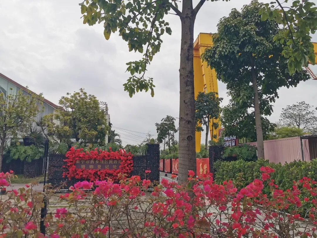 拍照打卡党绝对不能错过!这里的每一处角落都适配领证主题,出片率100%,不用刻意找角度,随手一拍都是氛围感大片。写有“西乡塘婚姻登记处”的白色门头简约大气,搭配门前的布景,喜庆又出片;凤凰树下,绿草如茵、花团锦簇,新人并肩而立,风一吹,连发丝都带着浪漫气息;告白墙上可以写下彼此的誓言,定格专属二人的甜蜜,时光隧道则承载着从心动到白首的期待,每一帧都适合珍藏。