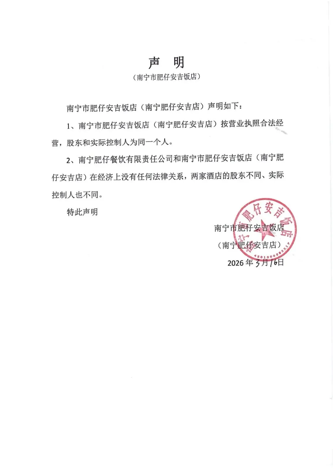「关于与"南宁肥仔餐饮有限责任公司"无关联的声明」