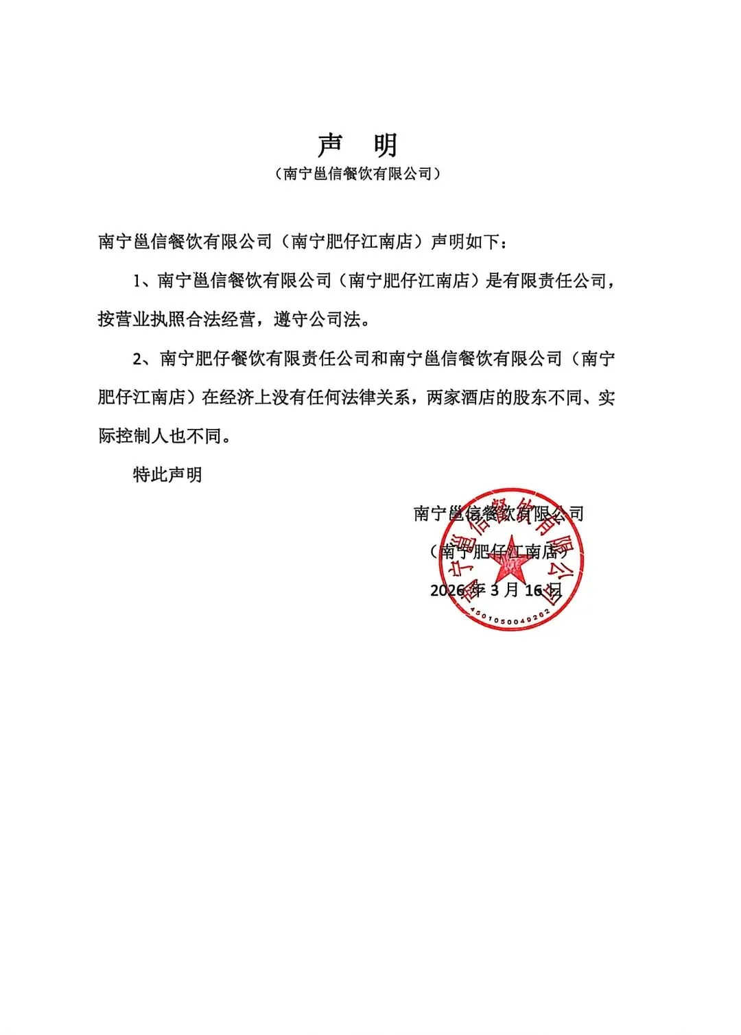 广西邕创餐饮管理有限责任公司(南宁肥仔星光店)、南宁市肥仔海鲜酒家(南宁肥仔人民店)、南宁市肥仔安吉饭店(南宁肥仔安吉店)、南宁邕信餐饮有限公司(南宁肥仔江南店)与南宁肥仔餐饮有限责任公司(南宁肥仔衡阳店、嘉和城店、大学店)并无法律和经济上的关联,并特此声明: