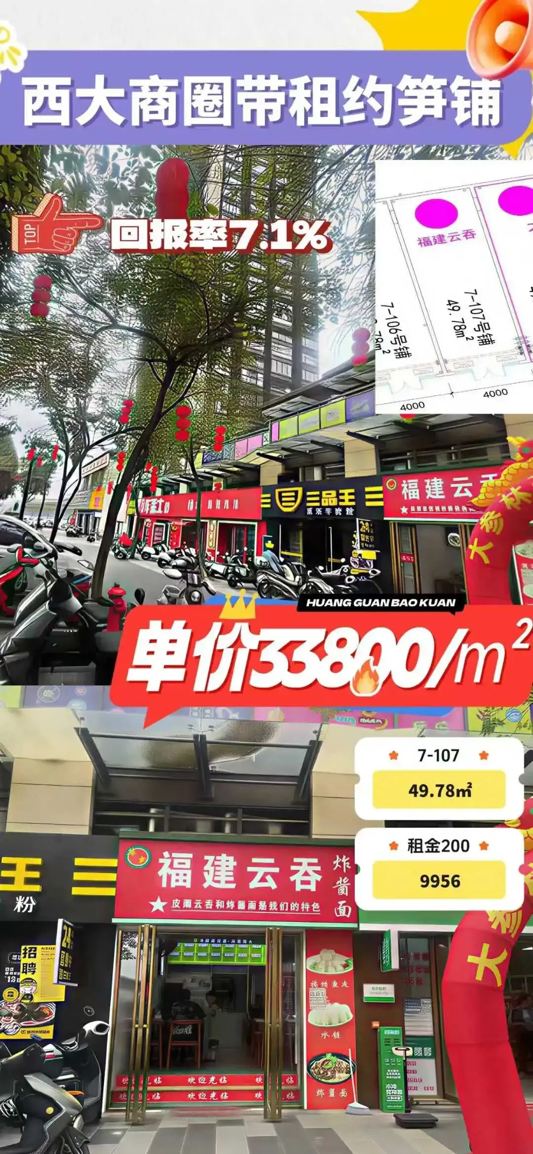 目前这个商铺已经被买了,还剩少量的优质商铺。这里这个地段算是南宁老城区里人流量非常大的地方了,而且就在广西大学和南宁城中村旁边,即使是3万多的单价,但是回报率是非常高。