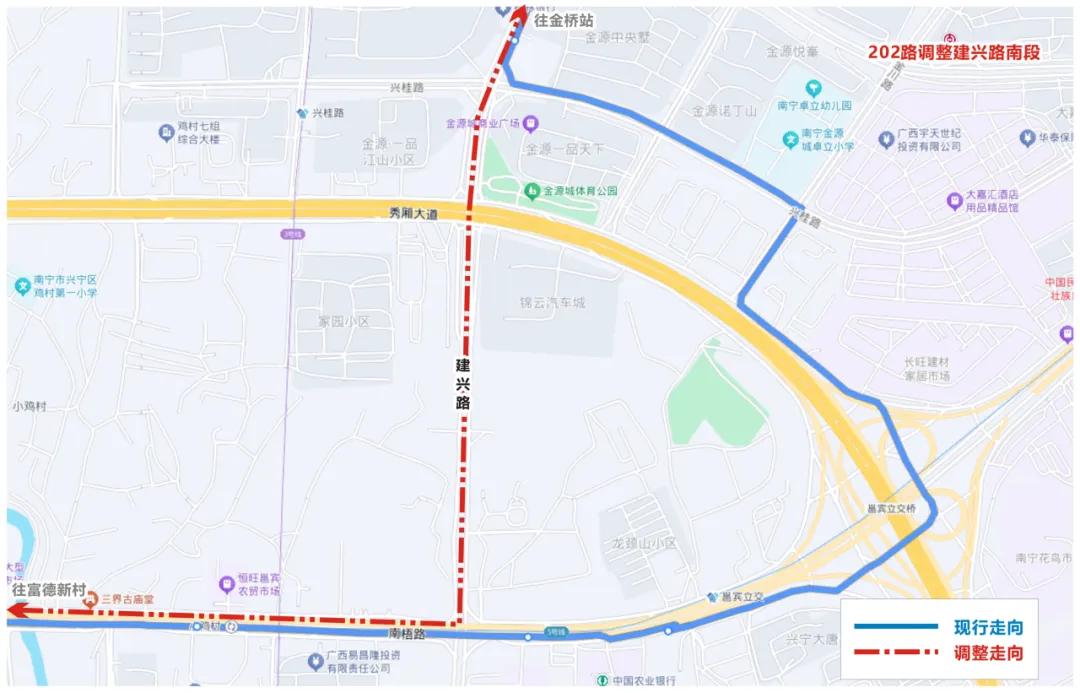 3.取消秀厢大道、金宁路(兴桂路至秀厢大道)路段行驶,并取消“秀厢建兴路口(北面)”1个单边停靠站点;