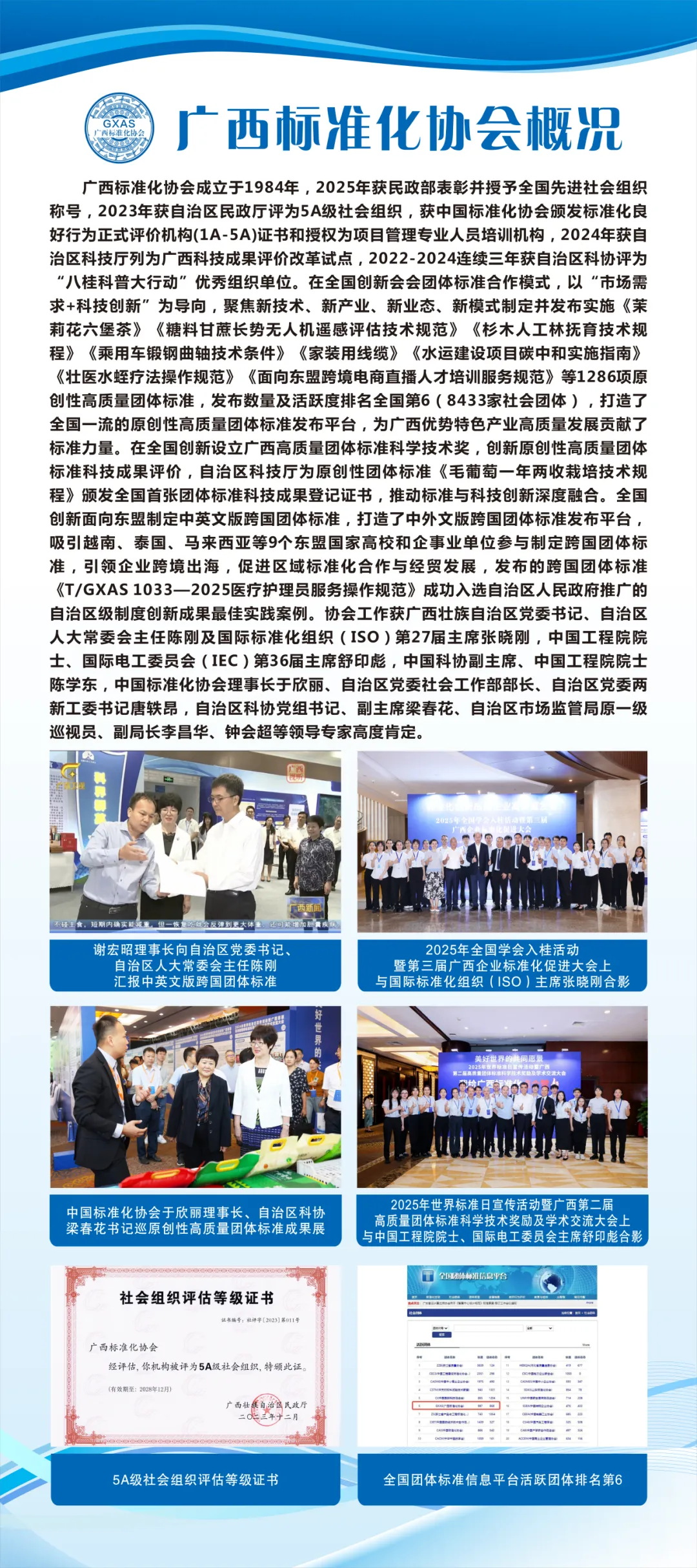 广西标准化协会提供国家标准、地方标准、团体标准、企业标准研制、标准化良好行为创建与评价、标准化试点示范项目创建等全过程指导和服务,以及CSPM等级证书培训: