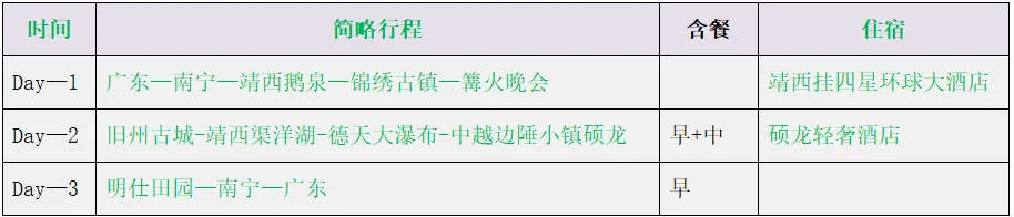 备注:德天镇位于广西崇左市大新县70公里的山区,是中越边境交汇处的一个小镇子,整个镇子无挂牌星级酒店,住宿条件比一般城市要落后,我们的产品在同等酒店的基础上优选干净卫生的宾馆供游客入住,敬请知晓!
