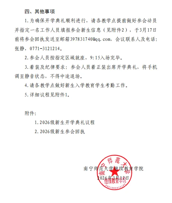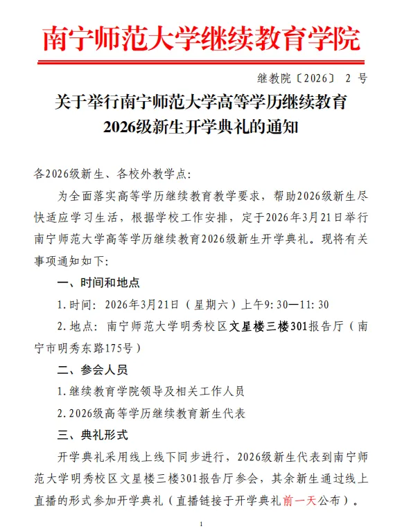 南宁师范大学继续教育学院2026级新生开学典礼的通知