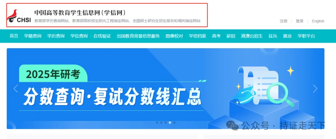 (1)在任意搜索引擎搜索“学信网”,找到“中国高等教育学生信息网(学信网)”。或者直接搜索网址http://www.chsi.com.cn/进入网站查询。