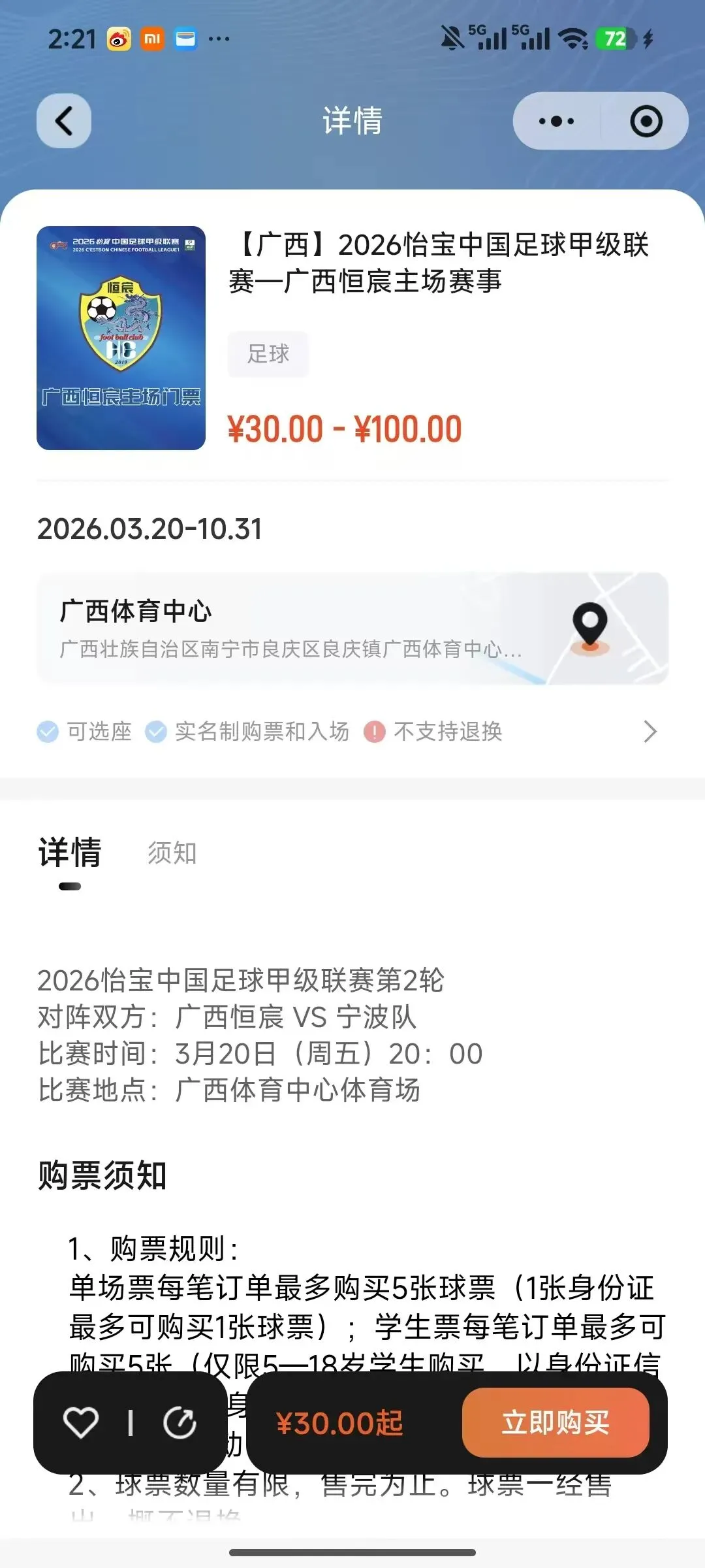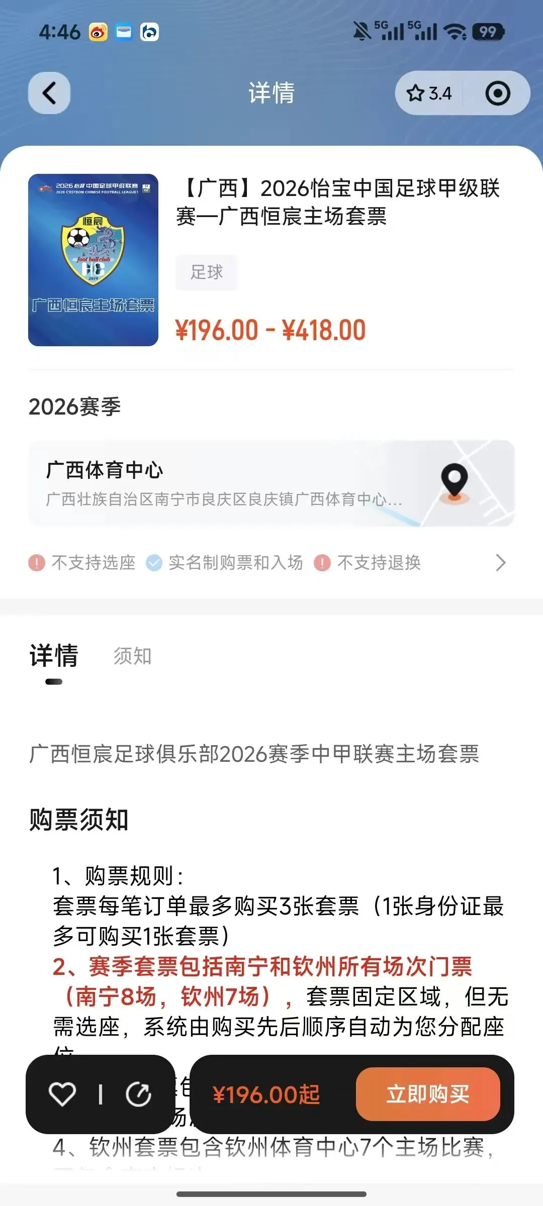 4. 选择对应票型(广西恒宸主场套票/广西恒宸主场门票),核对场次及席位信息