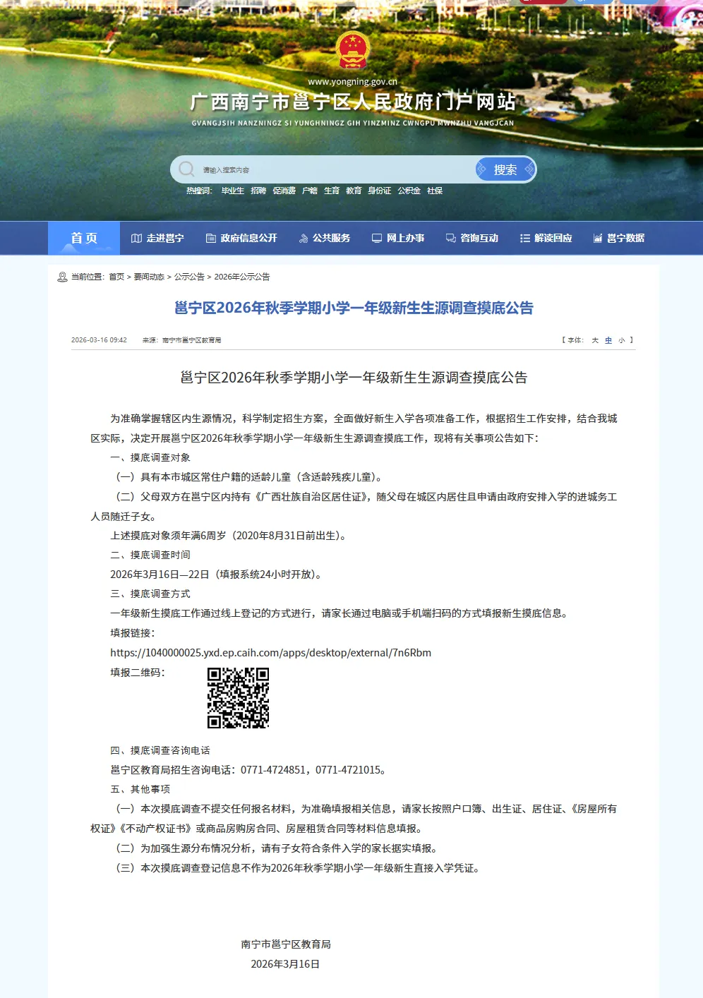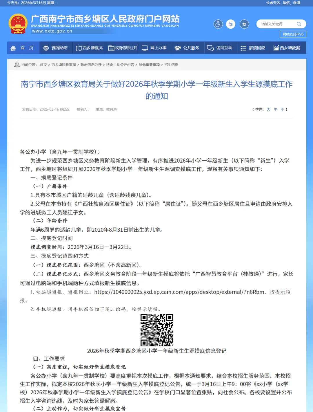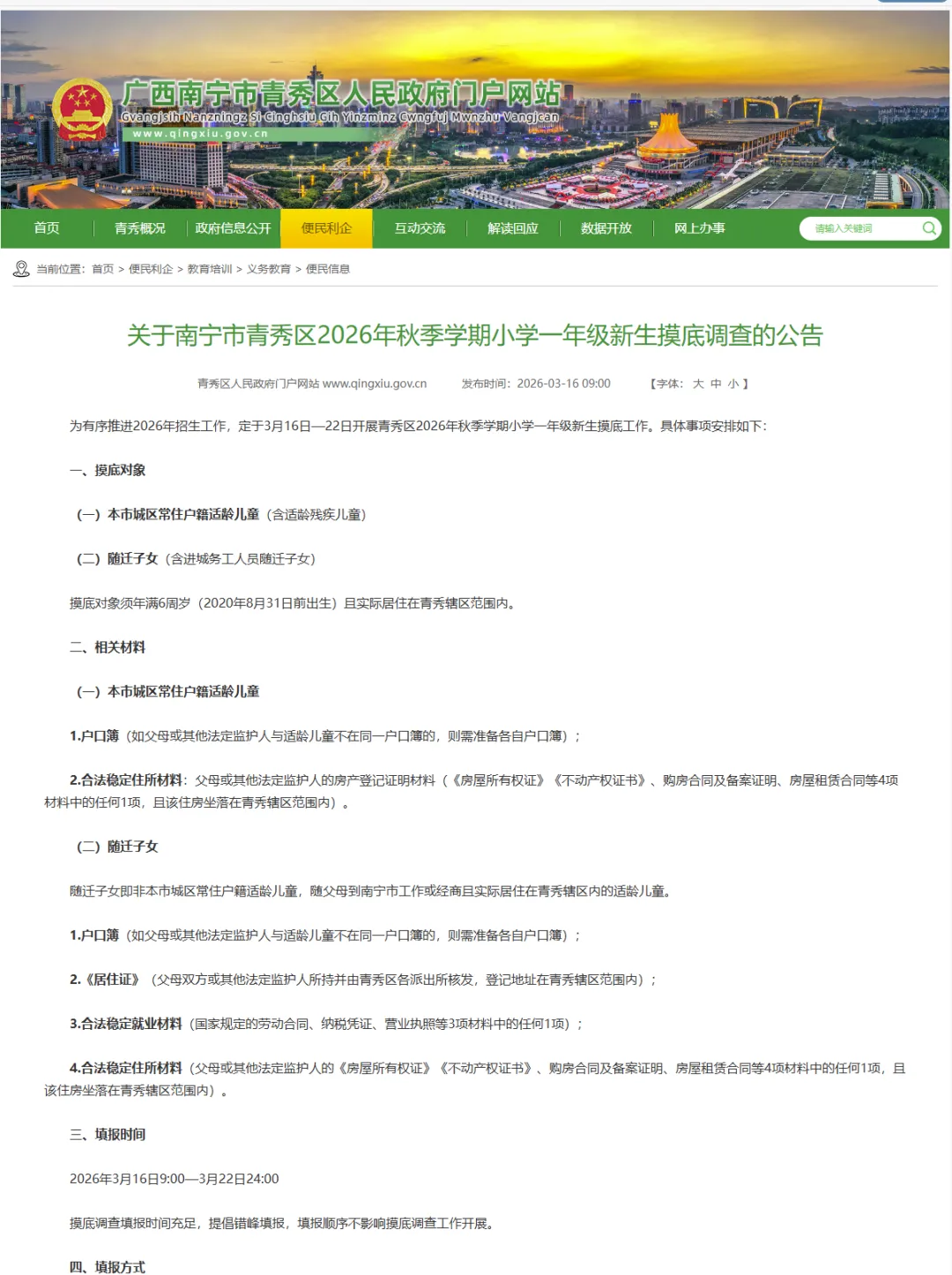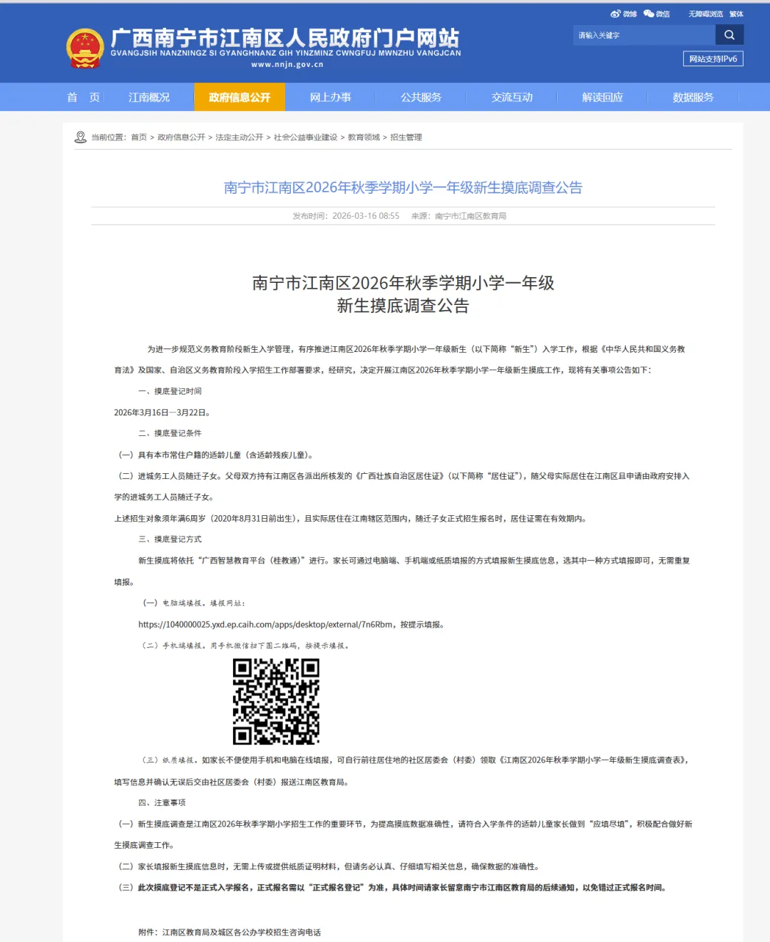 (一)新生摸底调查是江南区2026年秋季学期小学招生工作的重要环节,为提高摸底数据准确性,请符合入学条件的适龄儿童家长做到“应填尽填”,积极配合做好新生摸底调查工作。
