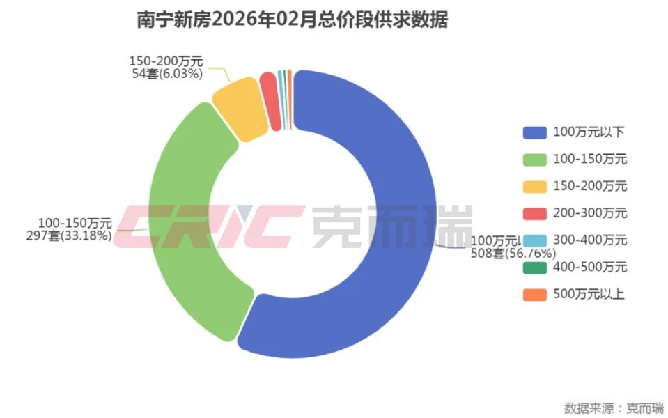2026年2月,南宁新房市场总价100万至150万元区间成交297套,150万至200万元区间成交54套,200万元以上各区间合计成交30套。