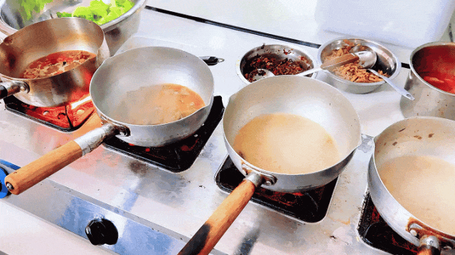 在下料这方面,老板真的是不吝啬,把顾客想要的鲜料用碟子装好,再麻利地把生料、配料依次放进铁锅里,大火煮上30秒就差不多出锅了!