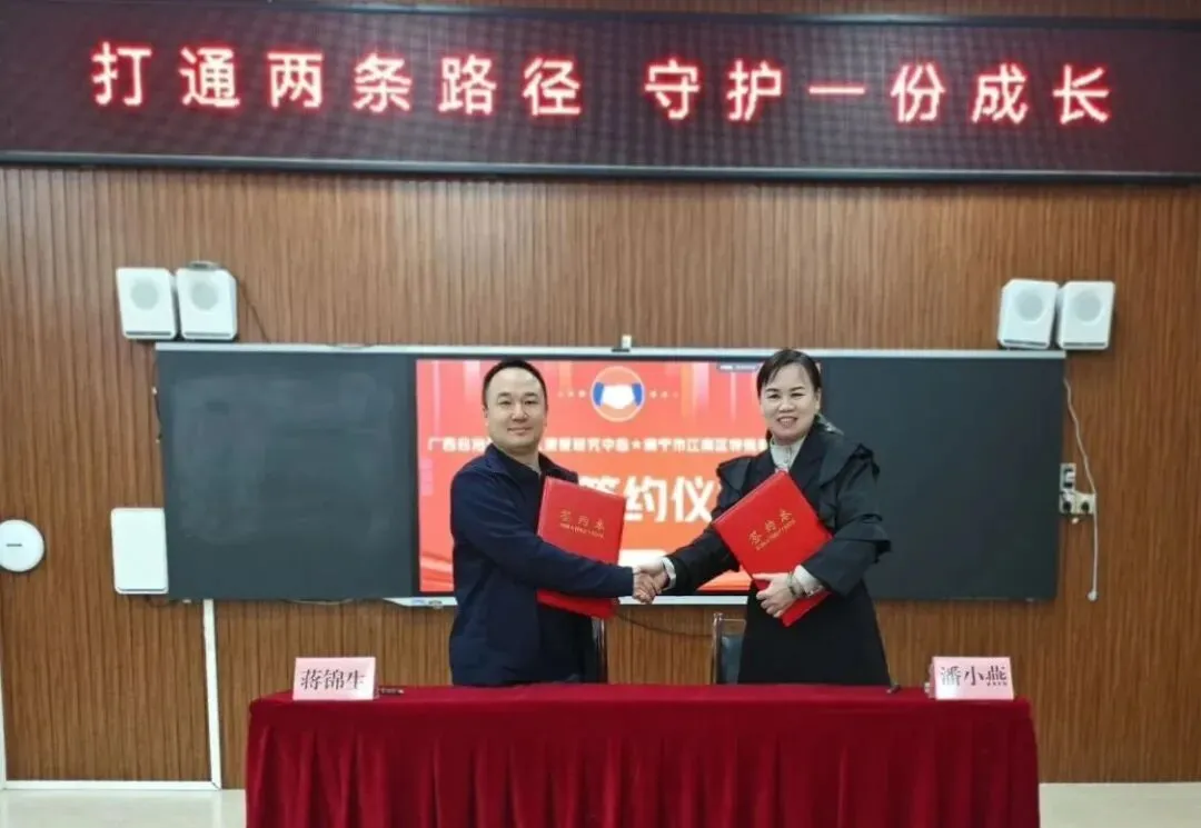 近日,广西壮族自治区残疾人康复研究中心副主任蒋锦生率专家团队到访南宁市江南区特殊教育学校,双方顺利举行签约仪式,该校正式成为“广西康教创新发展联盟”成员单位。潘小燕校长与蒋锦生副主任共同签署协议并揭牌,标志着江南区特殊教育在康教融合领域迈出关键一步。