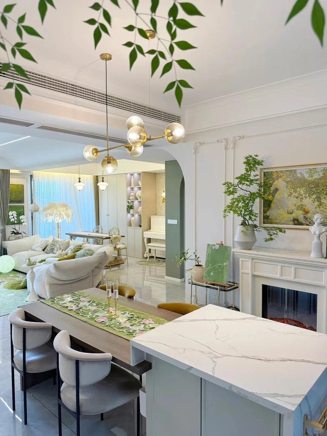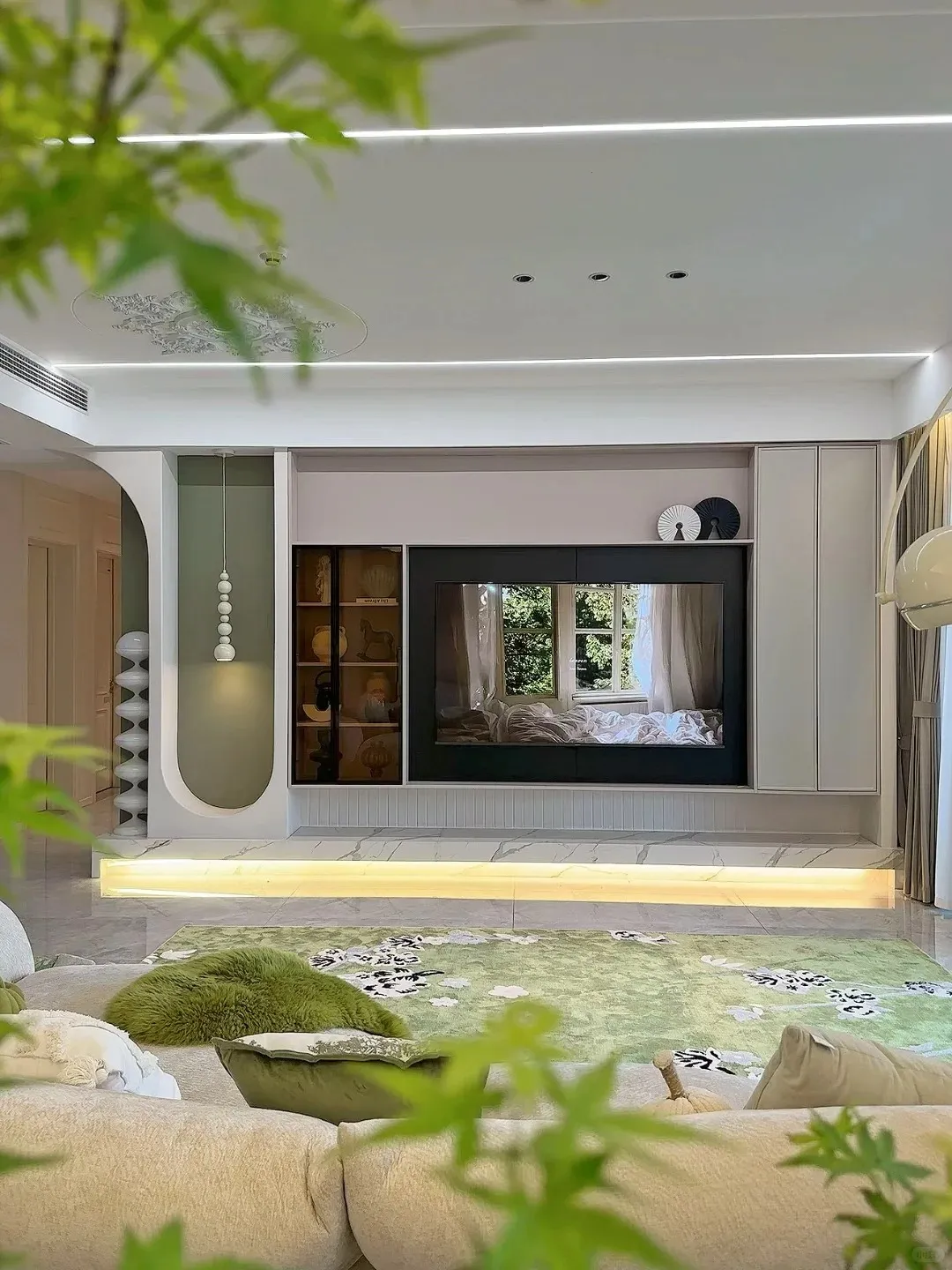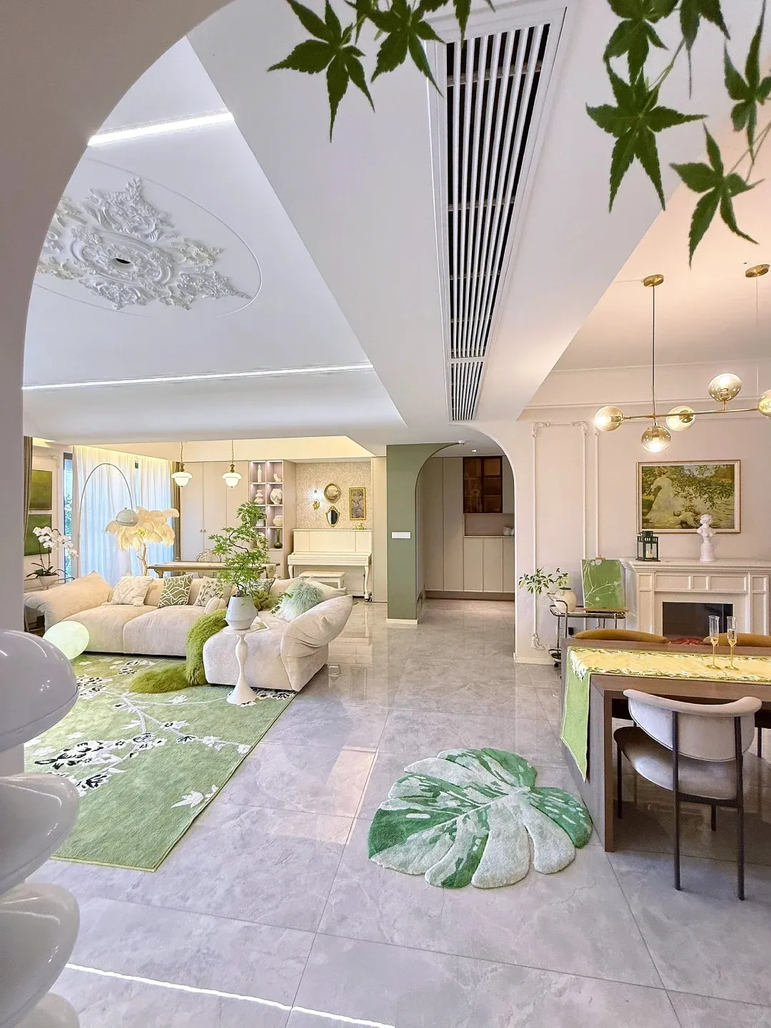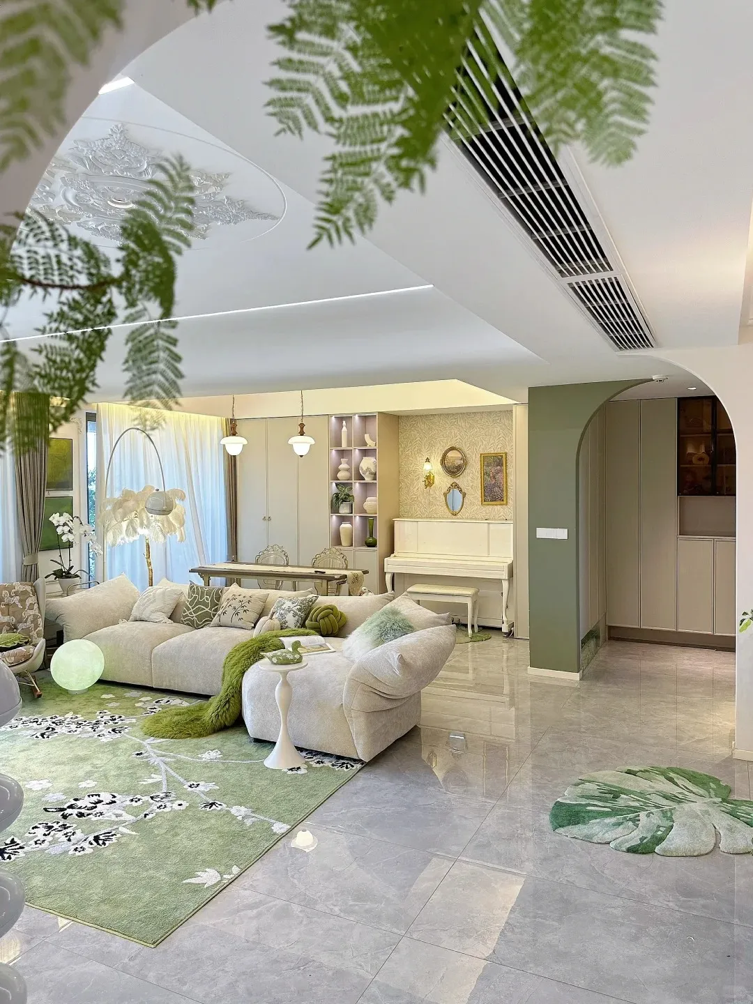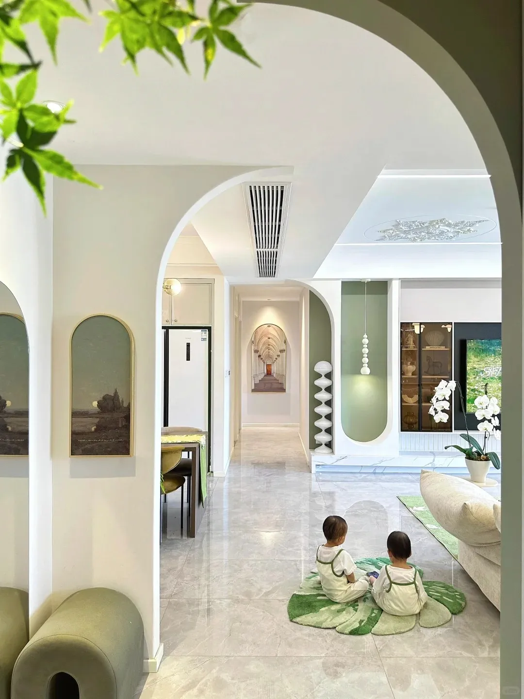 客厅拱形门洞细节,绿植点缀让空间更有生机02 客厅设计:温柔感拉满,带娃也不慌