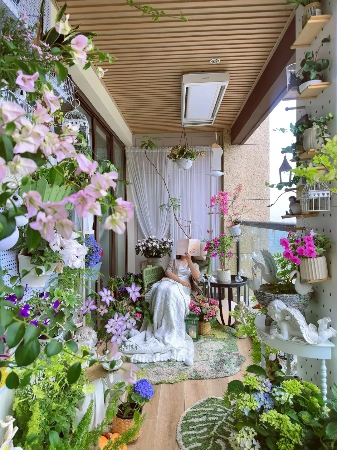 阳台是她家的“宝藏角落”!没有堆杂物,而是打造成了绿植区,三角梅、常春藤、绣球花摆了一圈,坐在藤编椅上晒太阳、喝茶,忙完带娃的琐事往这一坐,整个人都放松了。