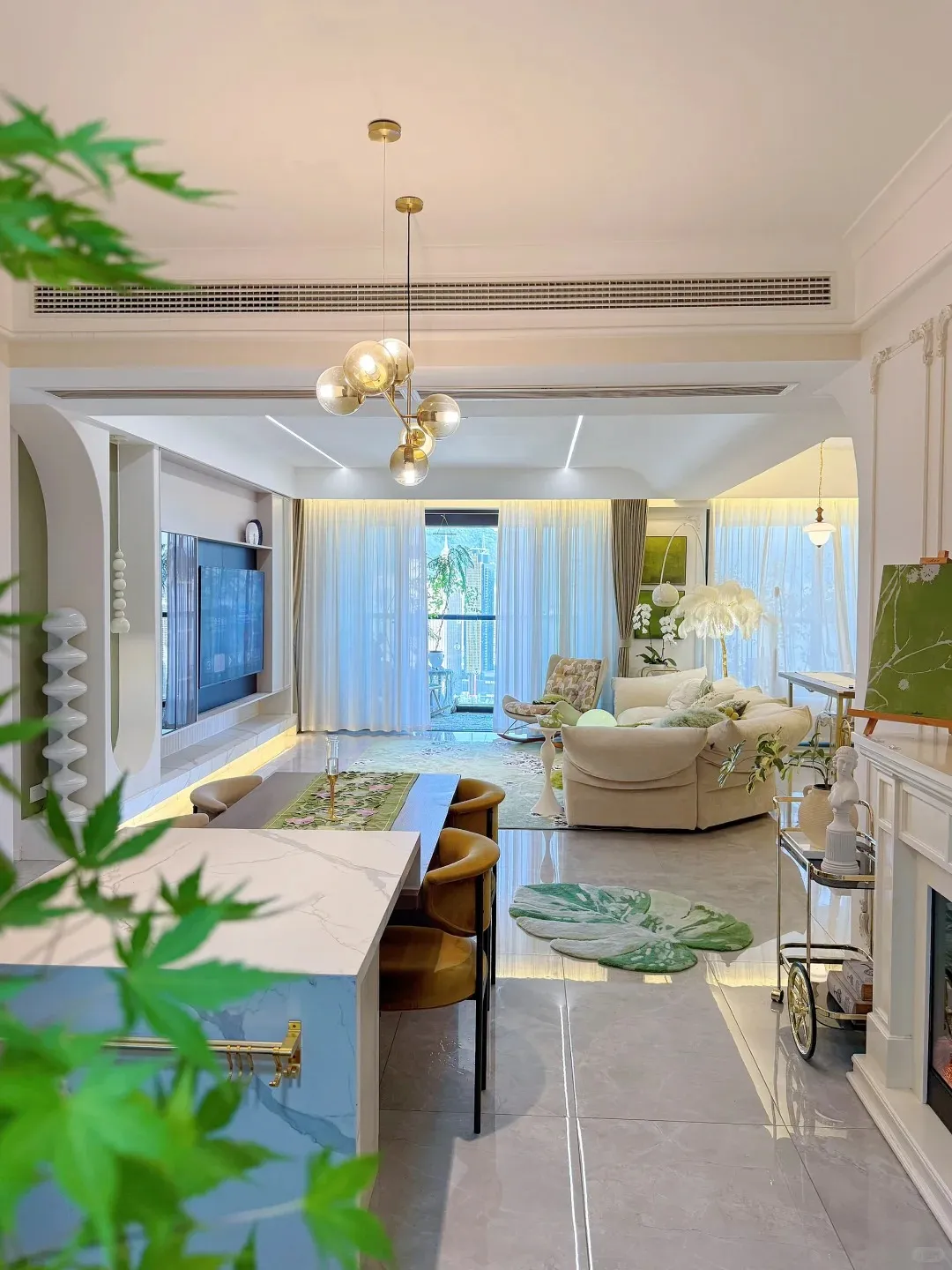 客厅整体效果,奶油白基调搭配拱形设计,温柔又通透01 装修思路:不卷奢华,只卷“住得舒服”