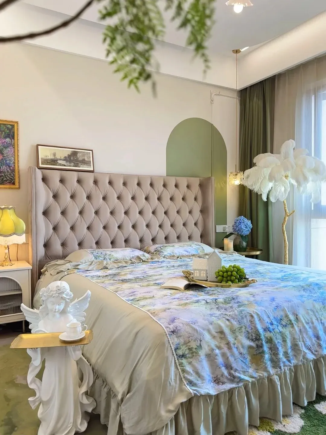 卧室就更简单了,软包床头+淡色系床品,没有多余的装饰,只在床头摆了几株小绿植,灯光选的是暖黄光,晚上哄娃睡觉不刺眼,早上拉开窗帘,阳光洒进来,起床都变开心了。