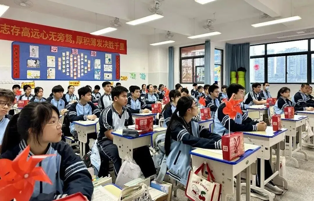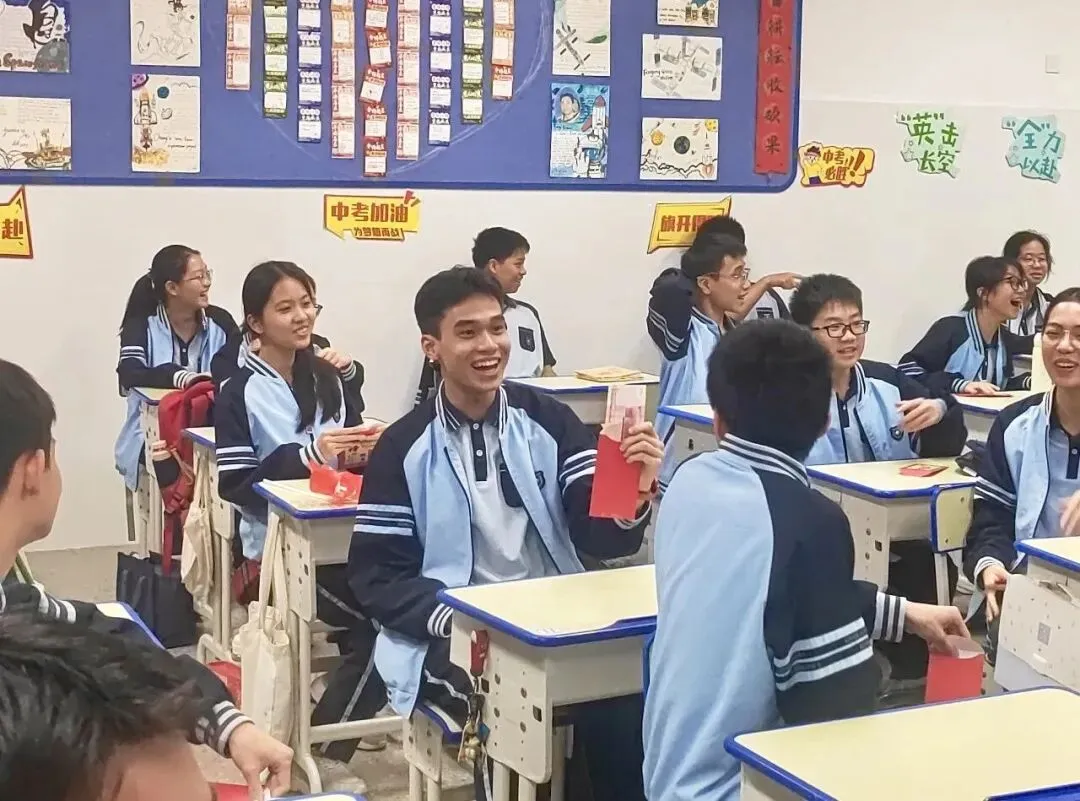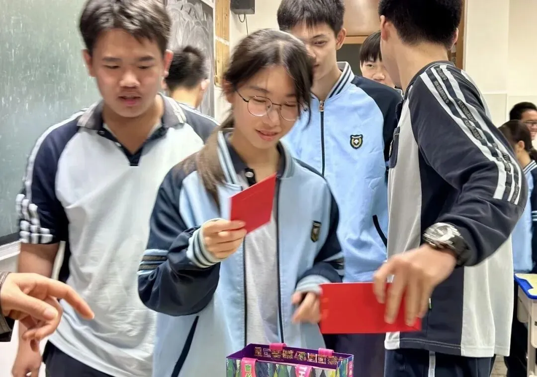 两枚面额 100 元的特等奖格外醒目 ——“100”的数字恰好呼应百日誓师的节点,藏着“百日拼搏、百炼成钢”的美好期许,将誓师的热血与祝福藏进小小的红包里。 当红包盒被推到教室中央,少年们瞬间围拢过来,眼神里满是期待与雀跃。