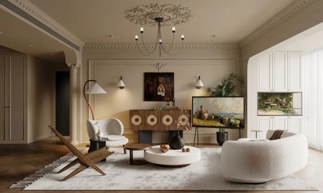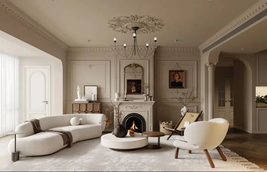 石膏线艺术:天花板的雕花石膏线、墙面的方框护墙板,是这套家的灵魂细节。不同于传统法式的繁复堆砌,这里的石膏线只做层次点缀:顶部的雕花吊顶呼应水晶吊灯,墙面的方框线条划分区域,既提升了层高,又让墙面摆脱单调,成为天然的装饰背景。