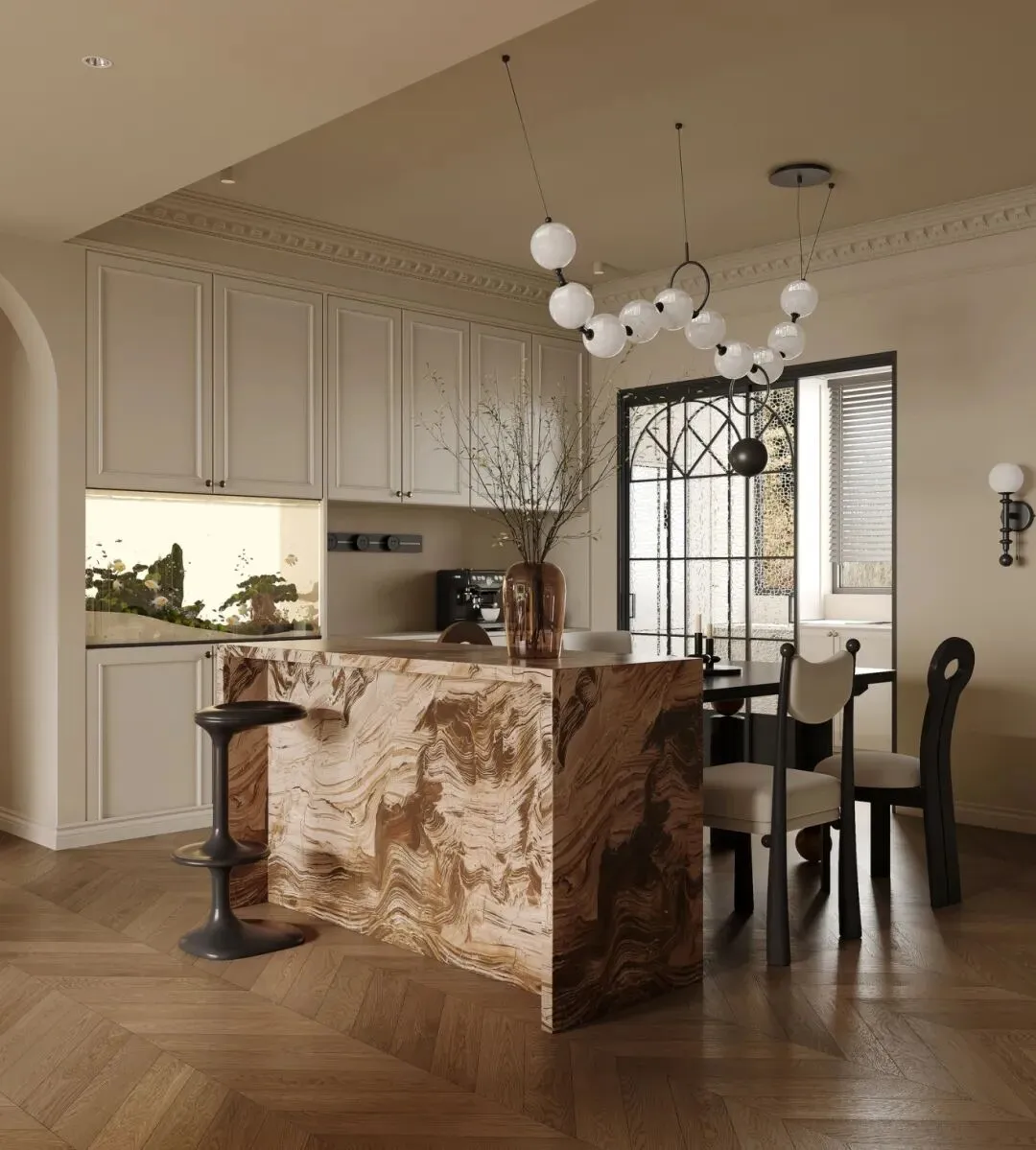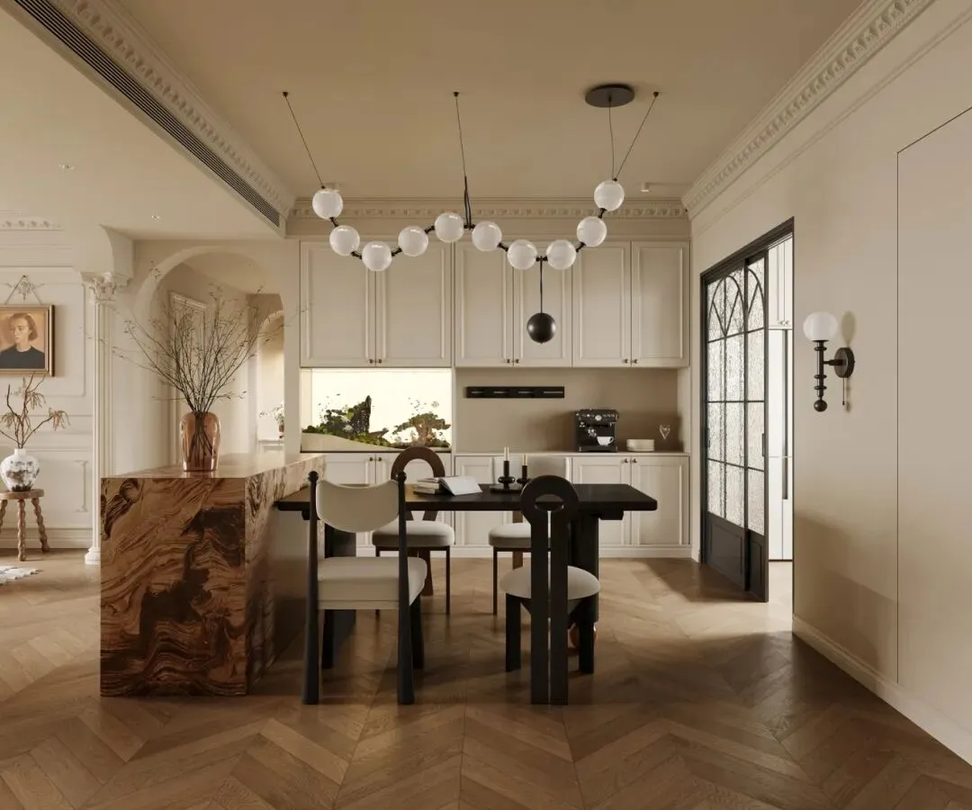客餐厅是这套家的核心公共区,开放式布局让空间通透开阔。客厅的弧形沙发围合出温馨的交流区,圆形茶几与落地灯呼应法式的圆润感,壁炉的暖光让家人围坐时更有归属感。餐厅与厨房相连,大理石岛台既是备餐区,也是早餐台,分子吊灯的玻璃球光影摇曳,让用餐时光也充满仪式感。