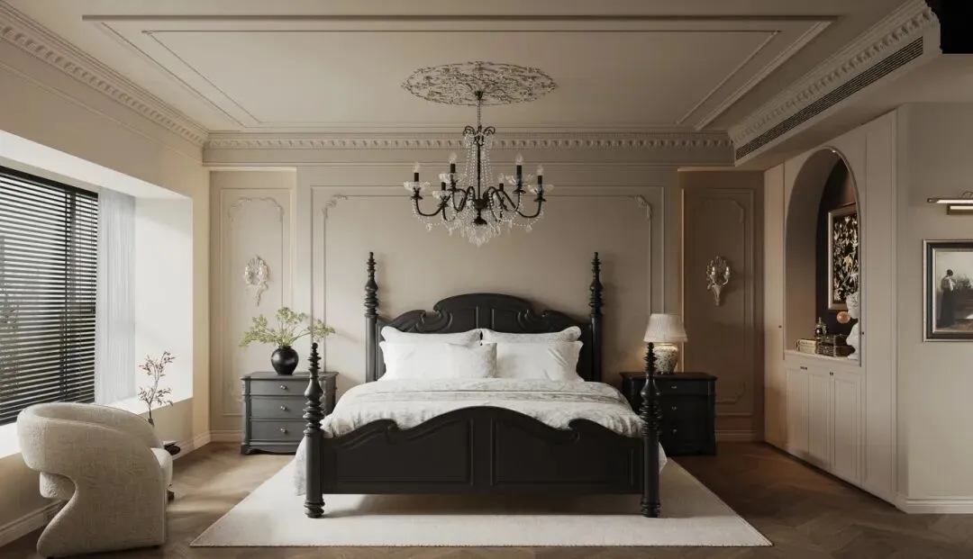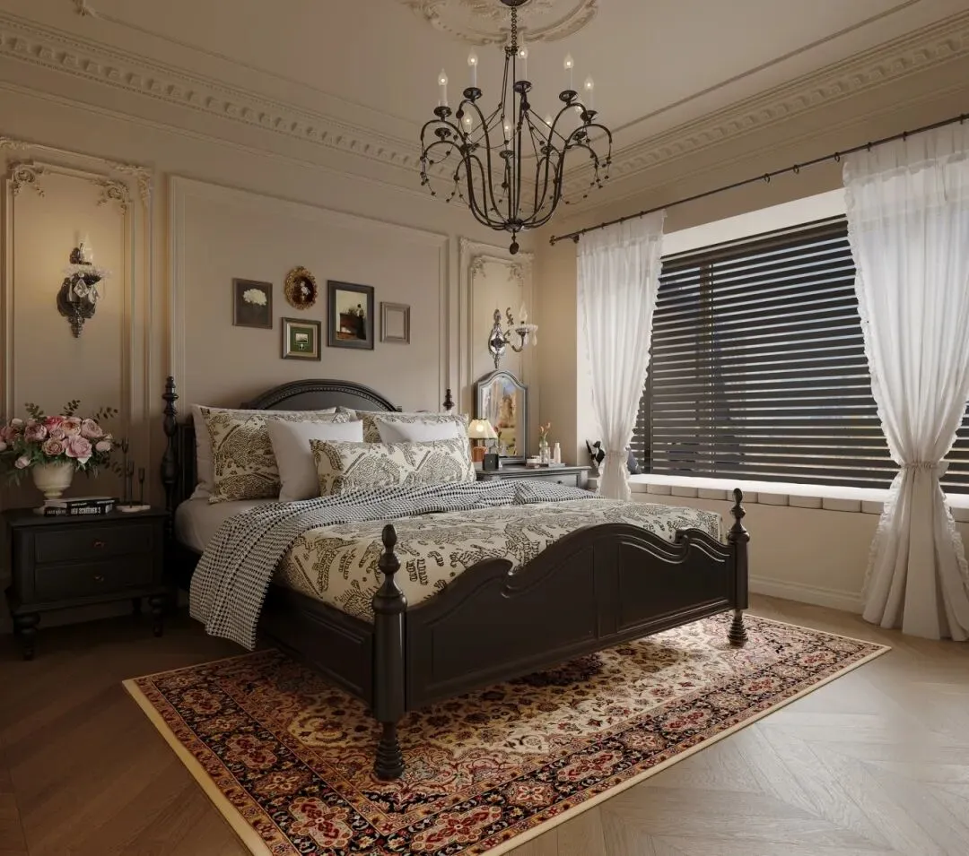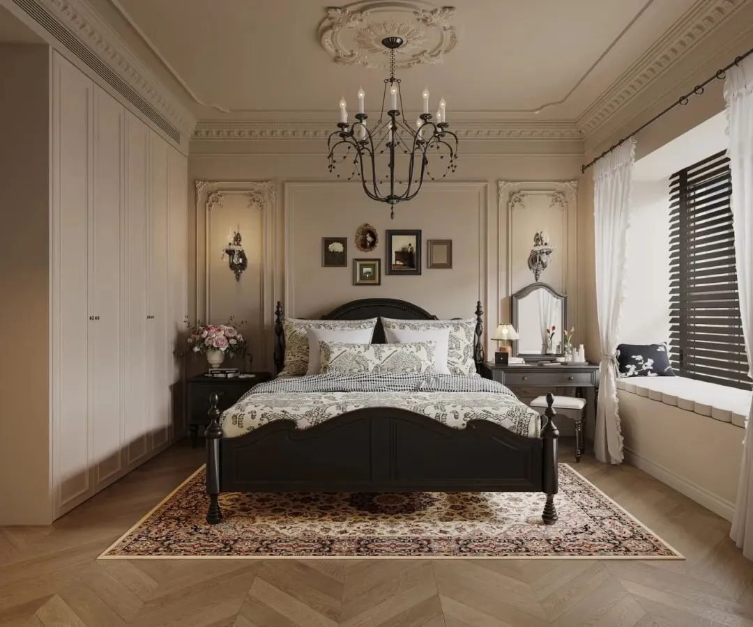深色实木家具:四柱床、高柜、餐桌均采用深胡桃木或黑色实木,圆润的雕花线条与硬朗的柜体结构,既呼应法式的优雅,又带来美式的踏实感。