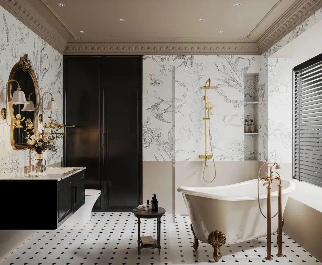 卫生间是法式精致感的集中体现:黑白金的配色经典高级,手绘花卉砖与菱形小花砖的搭配,让空间充满艺术感;独立浴缸与黄铜龙头花洒,复刻了法式酒店的奢华感;黑色高柜与镜前灯的组合,既满足收纳需求,又让洗漱时光变得优雅从容。