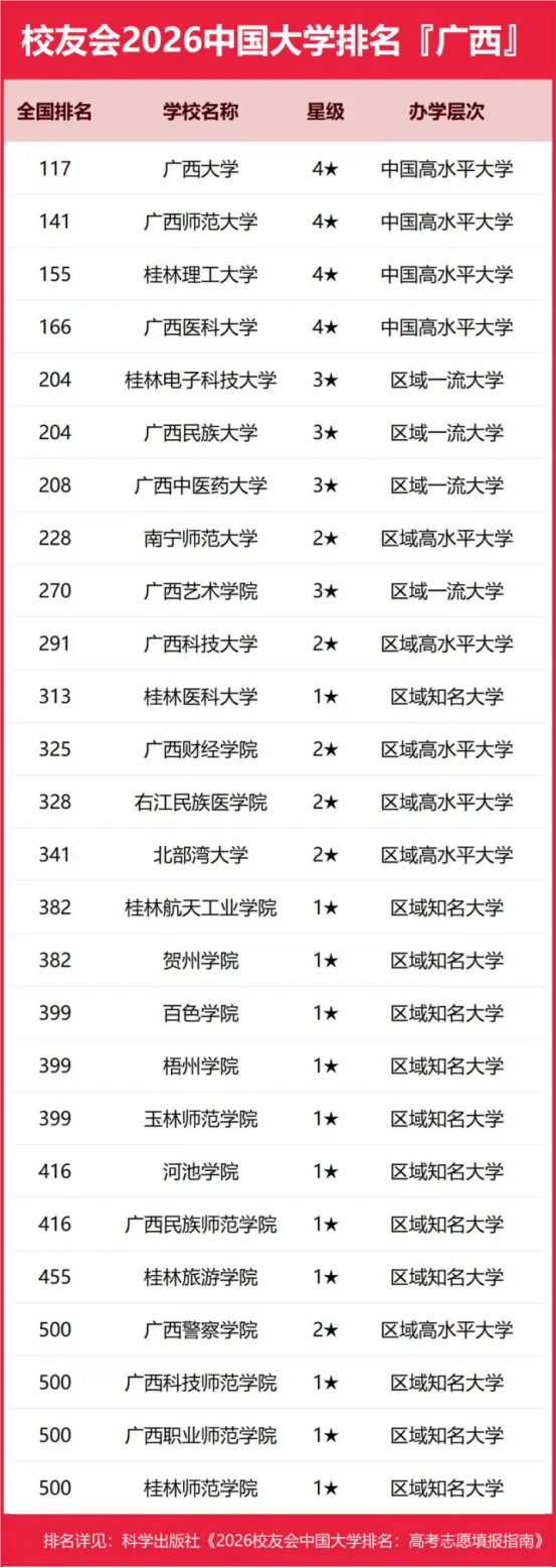 2026年校友会中国大学排名已经正式对外发布,广西壮族自治区高校的排名情况也一并公布出来,该榜单对广西区内多所高校展开评估与排序,结果体现出各校在全国范围内的相对位置和发展现状,依照这份榜单,广西大学依然处于区内领先地位,排在全国第117位,其办学层次被评定为中国高水平大学,星级为4星,广西师范大学紧随其后,排在全国第141位,同样得到4星评级与中国高水平大学层次,桂林理工大学此次排名为全国第155名,同样属于4星级的中国高水平大学,广西医科大学排在全国第166位,办学层次与前者一致。
