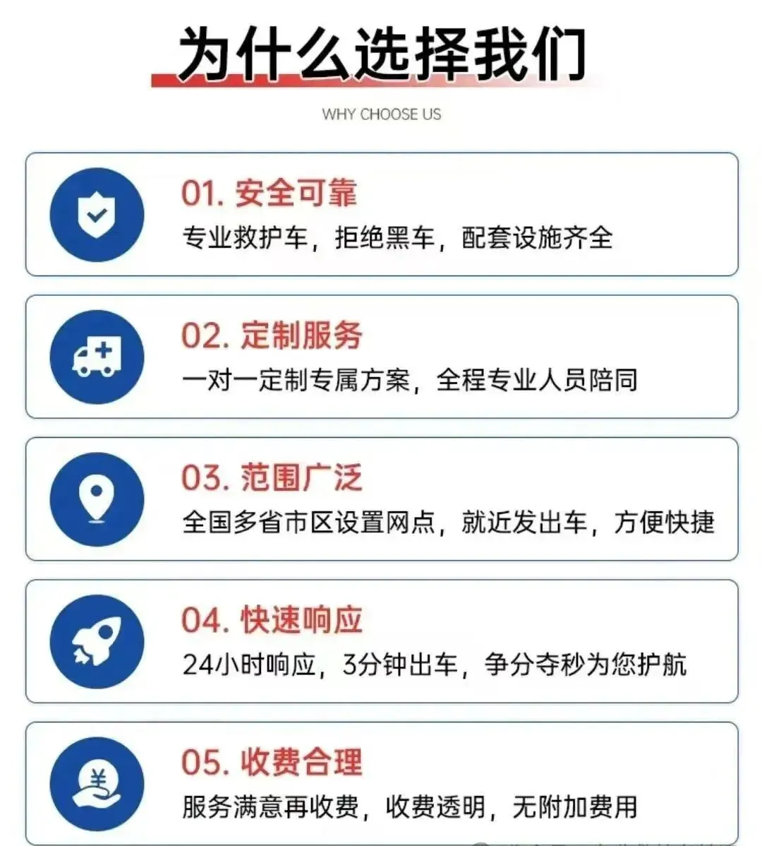 正规救护车转运服务,覆盖市内、长途、跨省等多种需求。配备呼吸机、监护仪等专业设备,医护随行,全天待命,为生命保驾护航。经验丰富的医疗团队可应对各类突发状况,车辆均投保专业责任险,让患者安心享受专业、规范的医疗转运服务。我们提供非急救120转运服务,专业承接各类病人转运。包括:长途跨省转运新生儿、骨折患者、重症及危重症患者;行动不便者复查、转院;以及遗体转诊、跨省返乡运送等业务,我们均能专业承接。