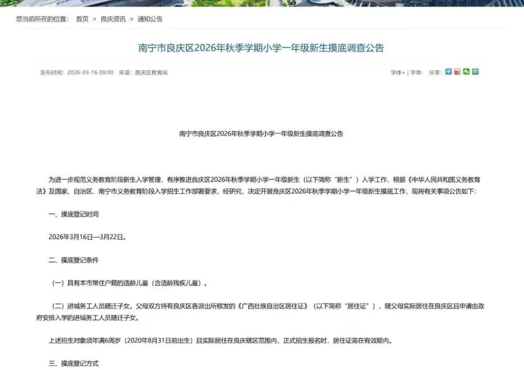 (一)新生摸底调查是良庆区2026年秋季学期小学招生工作中的重要环节,希望各位家长高度重视,积极配合。新生摸底不是正式报名,请家长留意良庆区教育局的后续通知,以免错过正式报名时间。