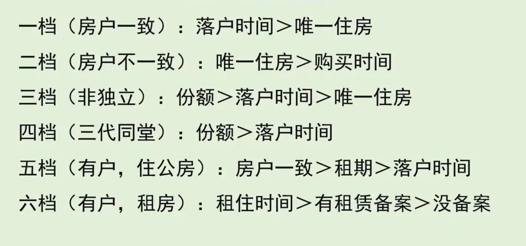 目前南宁的入学政策是按照学校的地段划分,以落户时间、是否唯一住房、产权比例、房户一致性等划分为六档排序: