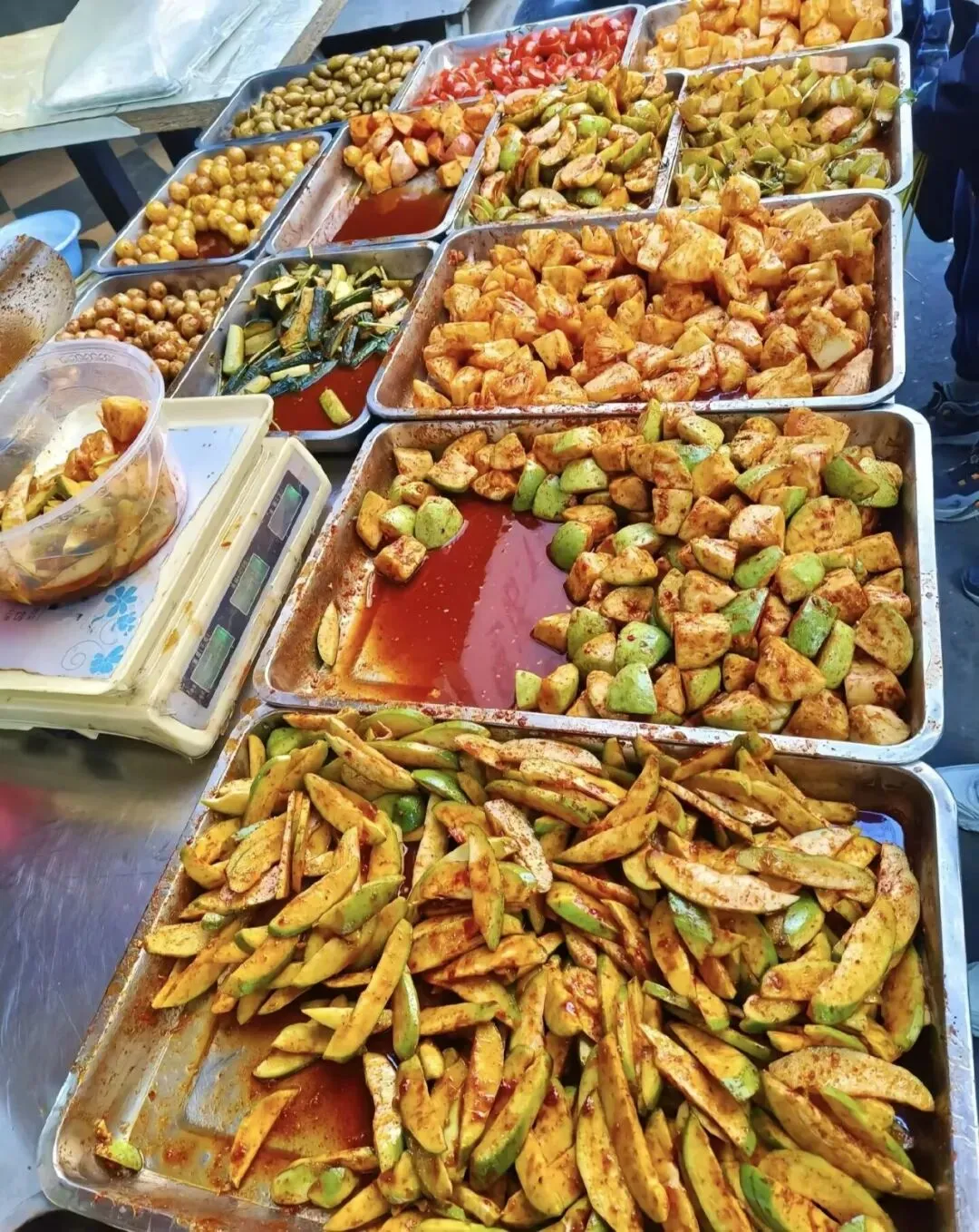 南宁酸嘢顶流,青芒果、菠萝、番石榴、李子撒上辣椒粉,酸辣脆爽,解腻又开胃,逛街必备小吃,本地人从小吃到大。