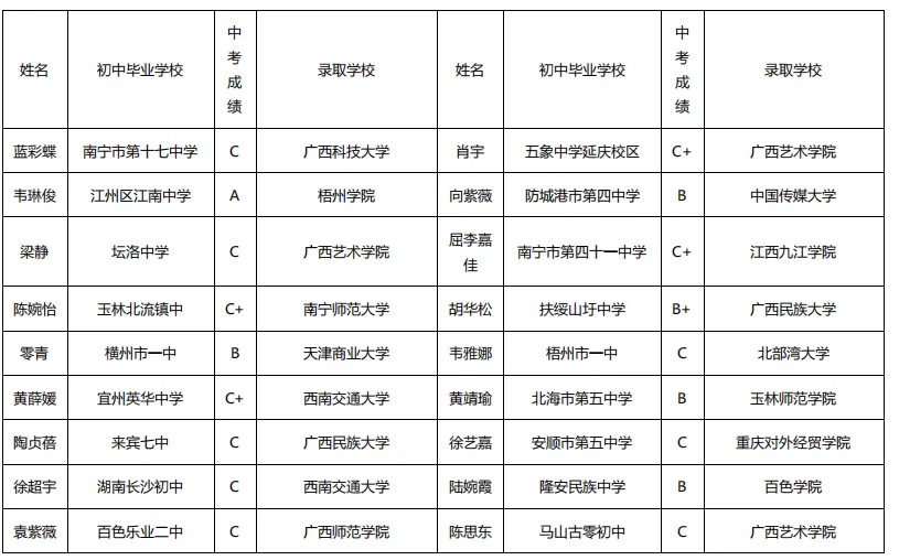 近年来,综合高中部众多中考成绩 C 档及以上的学生,成功考入中国传媒大学、西南交通大学、广西大学、广西艺术学院等区内外知名院校,印证 “低进高出” 培养成效。