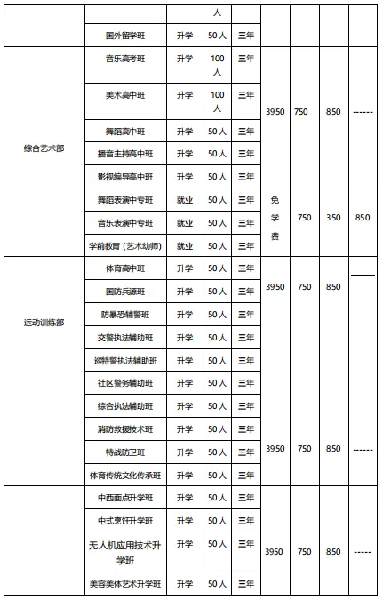1.体育高考班:文化课 + 体育专业课(身体素质项目 + 专项素质项目);与广西体育高等专科学校订单式合作,可直升该校或参加体育统考、普通高考。2.爱国特色教育班:文化课 + 国防教育训练、执法辅助类课程(防暴恐、交警等)、消防救援技术等;毕业可参军入伍、报读士官学校或继续深造,就业面向公安、交警、城管、消防等系统辅助岗位。(四)综合技能部