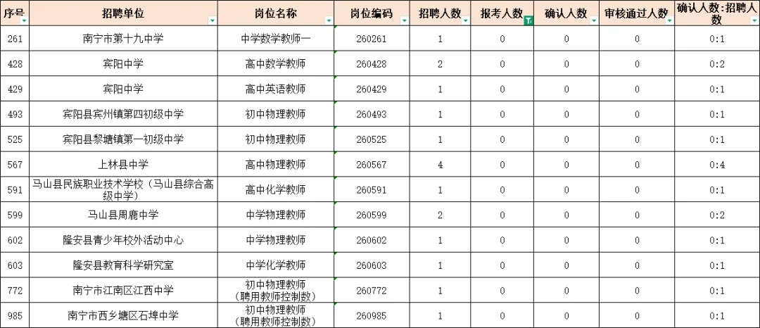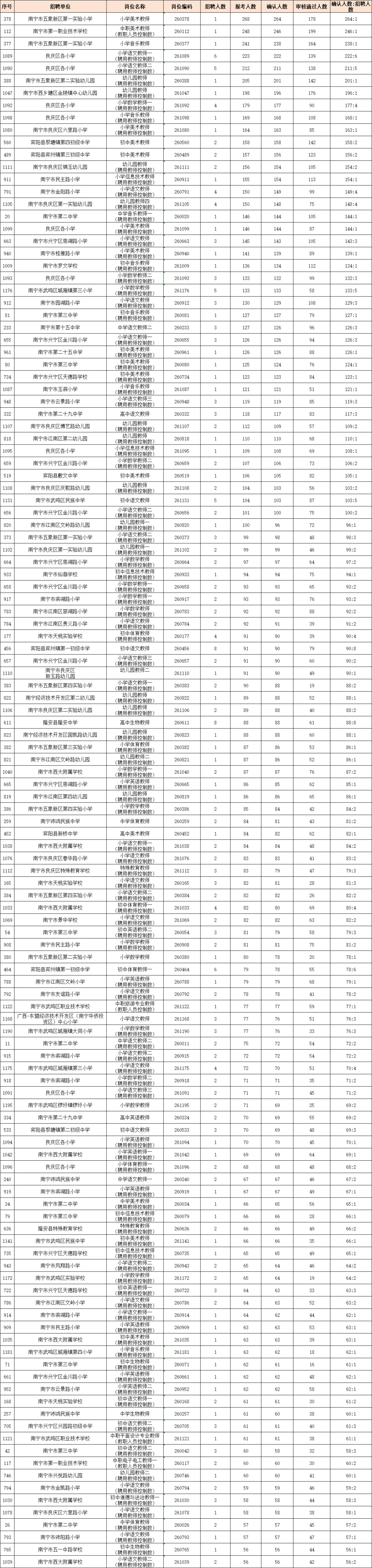 其中报名人数排前三的岗位分别是:南宁市五象新区第一实验小学,小学美术教师岗,招1人,当前报考人数268人;南宁市第一职业技术学校,中职美术教师,招1人,当前报考人数248人;南宁市五象新区第一实验小学,小学音乐教师,招1人,当前报考人数241人。