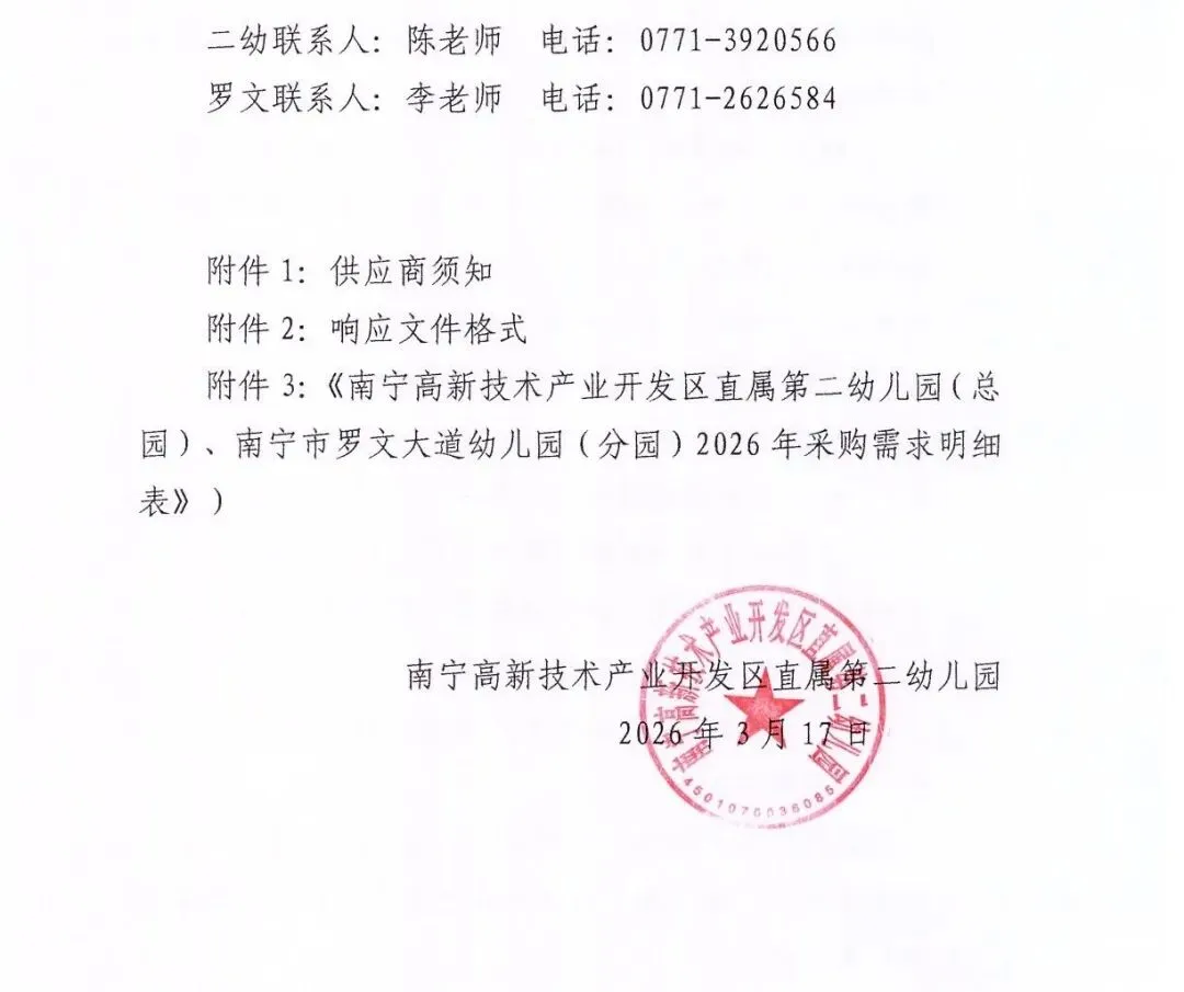 >南宁高新技术产业开发区直属第二幼儿园(总园)、南宁市罗文大道幼儿园(分园)关于公开征集2026年度零星物资及服务供应商公告