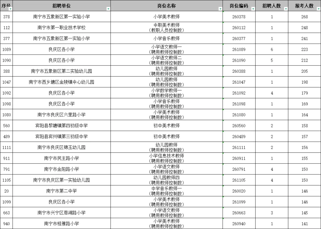 截止3月17日9:00,南宁教招报考总人数31838人,其实最热岗268人报名,南宁市五象新区第一实验小学;报名人数超100人的岗位共42个岗。
