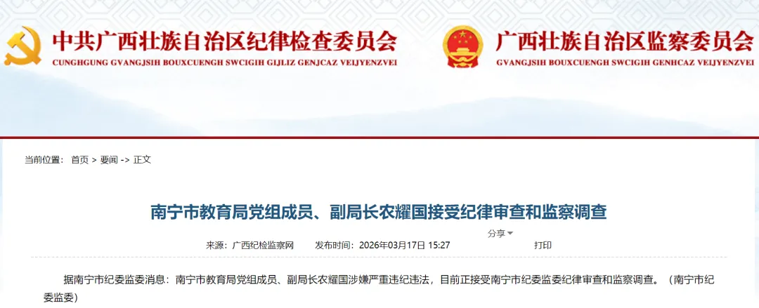 南宁市教育局党组成员、副局长农耀国涉嫌严重违纪违法,目前正接受南宁市纪委监委纪律审查和监察调查。