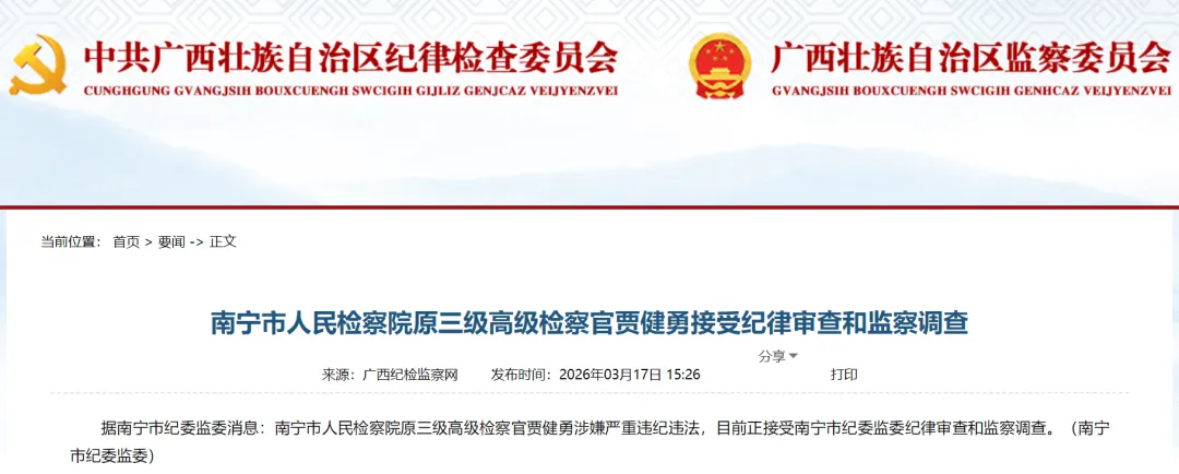 南宁市人民检察院原三级高级检察官贾健勇涉嫌严重违纪违法,目前正接受南宁市纪委监委纪律审查和监察调查。